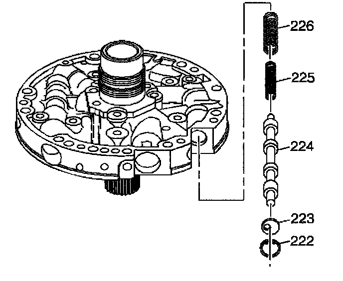 7. Remove the converter clutch valve inner (225) and outer (226) springs.