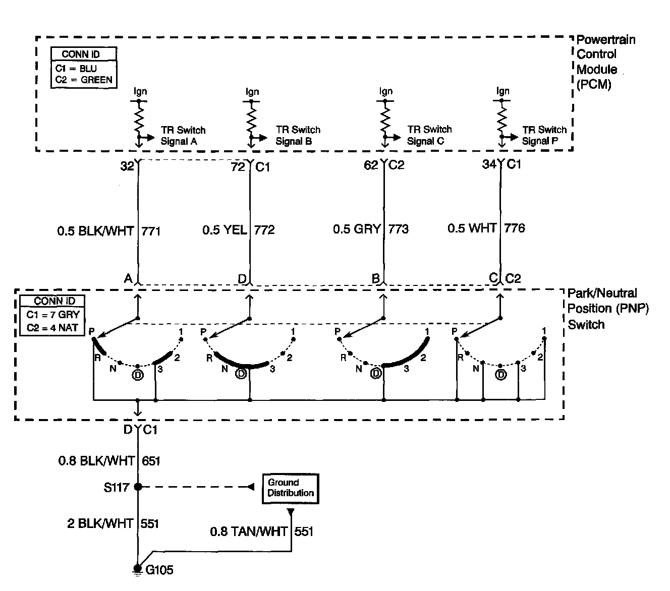 Refer to the Transmission Range Switch Logic table for valid combinations of switch signal circuits A, B, C and Parity. On the table, HI indicates an ignition voltage signal. LOW indicates a zero voltage signal.
