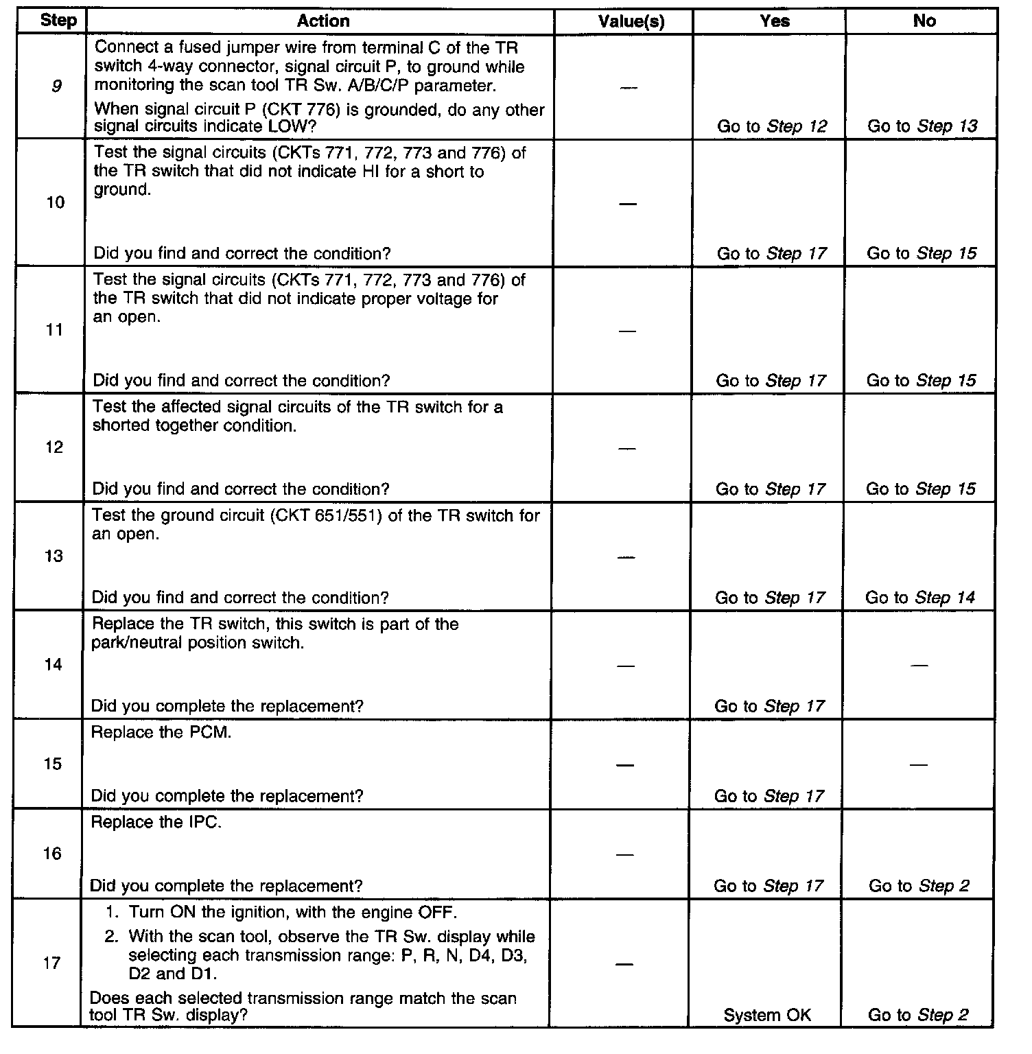9. This step tests the TR switch wiring and the PCM by providing a ground path through a fused jumper wire. When grounded, the scan tool range signal states should change to LOW.