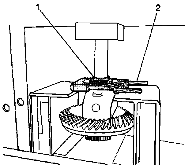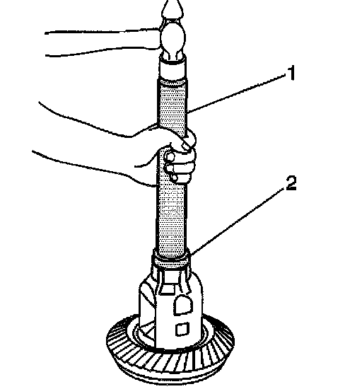 ^ Install the J 25299 (2) and the J 8092 (1) onto the differential case bearing as shown.