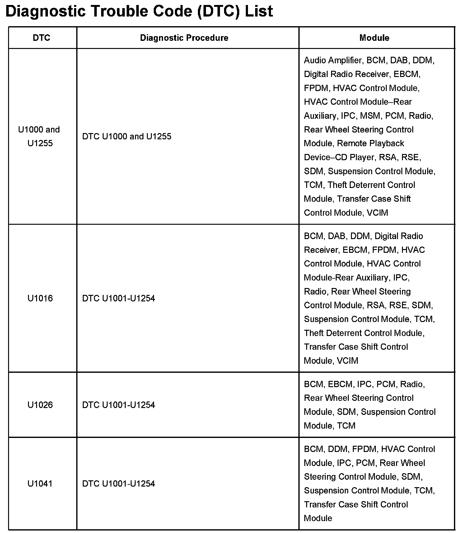 DTC U1000 - U1041:
