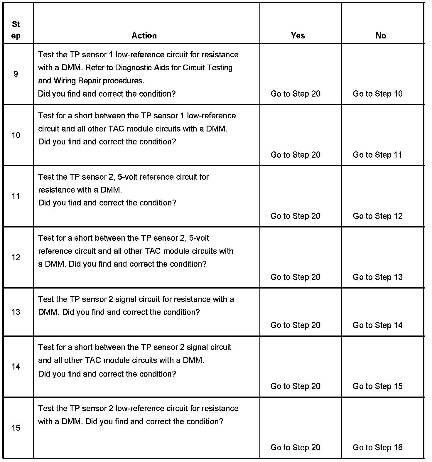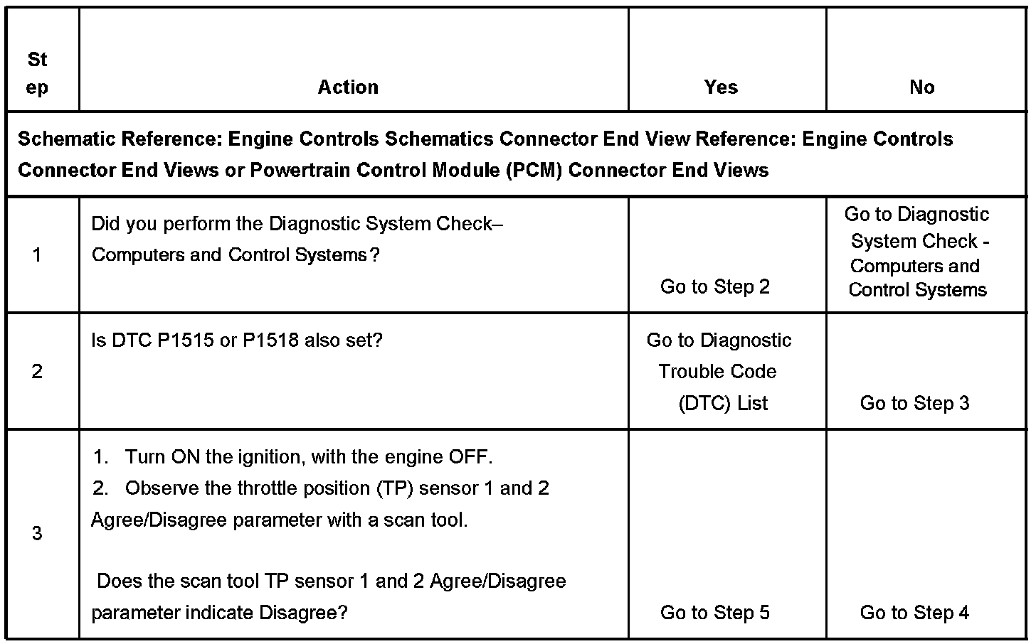 The TP sensors are used to determine the throttle plate angle for various engine management systems. The control module provides each TP sensor a 5-volt reference circuit and a low reference circuit. The TP sensors then provide the control module with signal voltage proportional to throttle plate movement. Both TP sensor signal voltages are low at closed throttle and increase as the throttle opens. When the control module detects that TP sensor 1 signal and TP sensor 2 signals disagree or signal voltages are outside the predetermined range, this DTC sets.