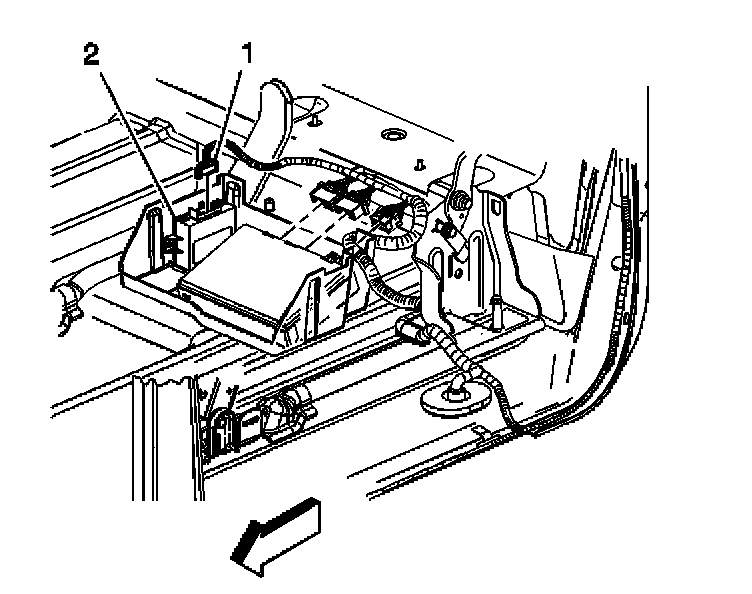 5. Disconnect the electrical connector (1) from the rear object alarm module (2).