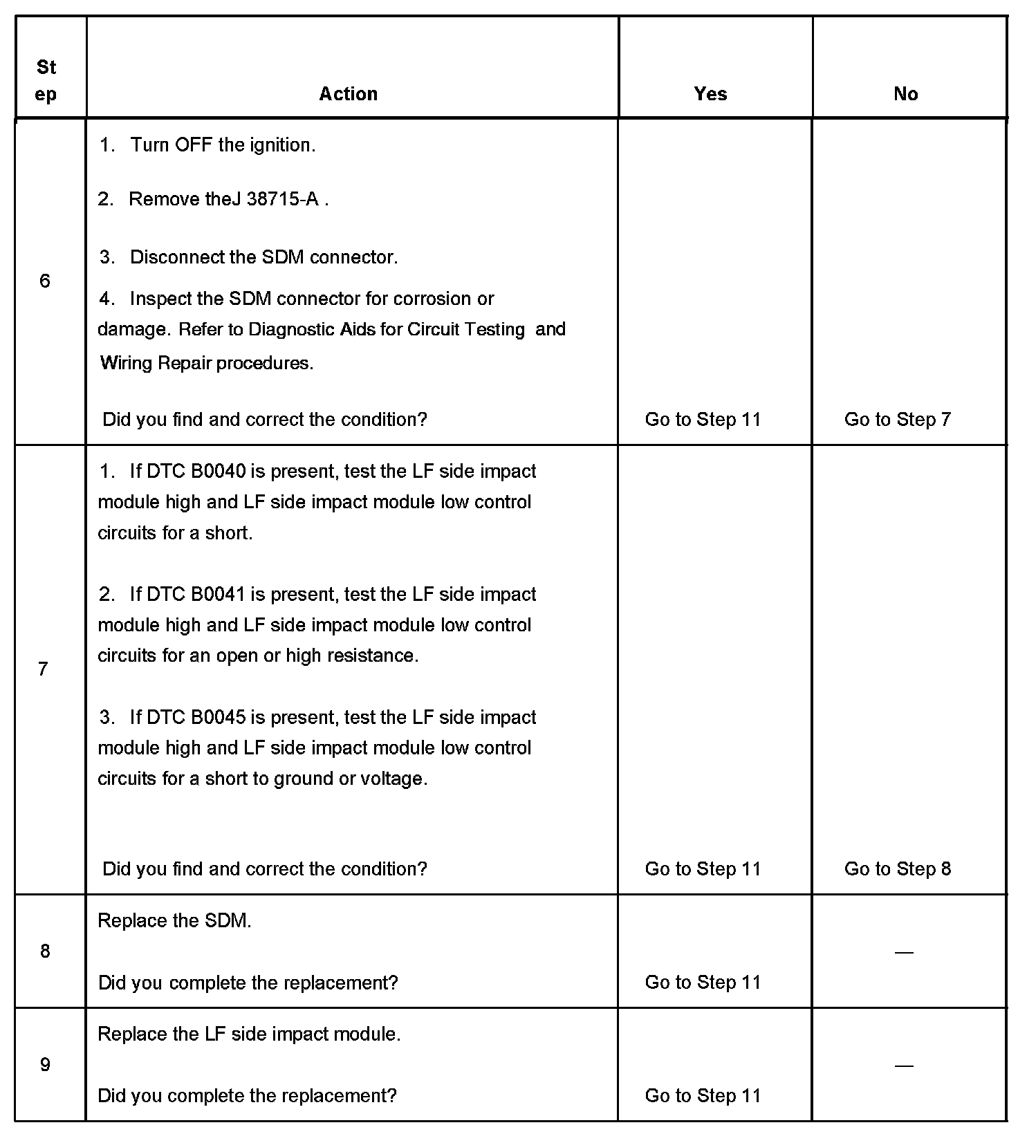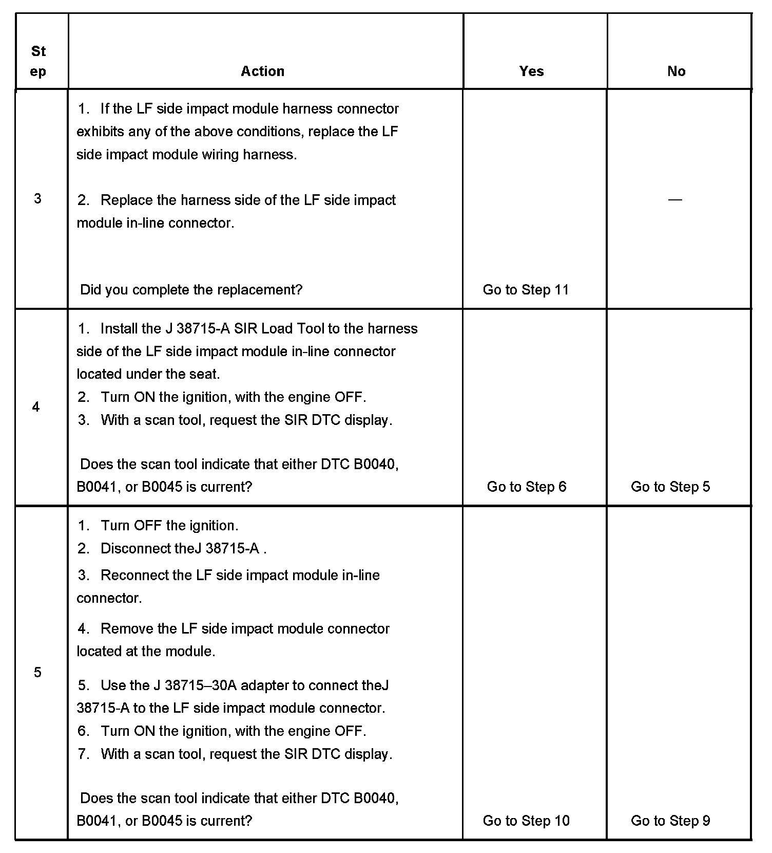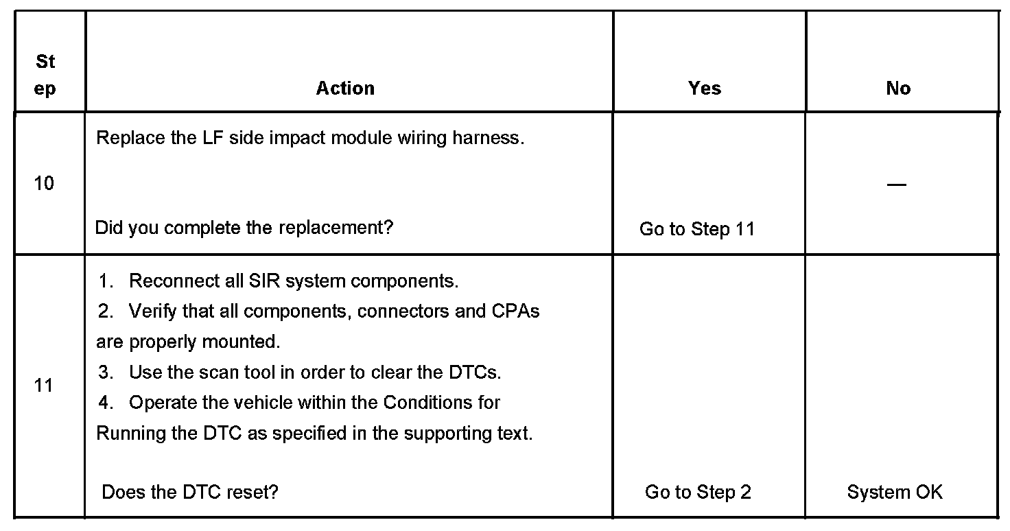 7. If DTC B0040 is present, test for a short between the LF side impact module high and LF side impact low control circuits. If DTC B0041 is present, test for an open or high resistance in the LF side impact module high and LF side impact module low control circuits. If DTC B0045 is present, test for a short to ground or voltage in the LF side impact module high and LF side impact module low control circuits.
