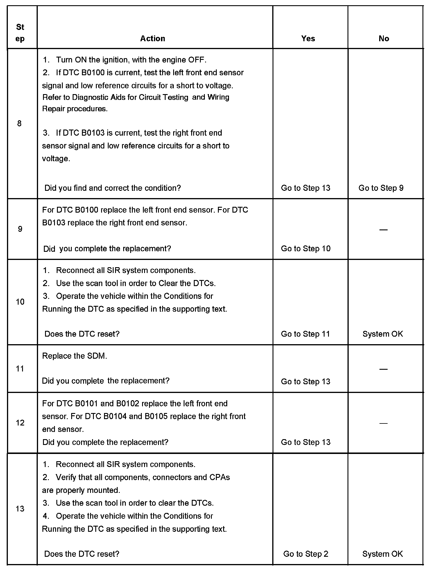 CIRCUIT DESCRIPTIONThe inflatable restraint front end sensor utilizes a unidirectional 2-wire circuit. The front end sensor modulates current on the interface to send ID, State of Health, and deployment commands to the inflatable restraint sensing and diagnostic module (SDM). The SDM serves as a power source and a ground for the front end sensor. When the ignition is turned on and input power from the SDM is first detected, the front end sensor responds by performing internal diagnostics and sending an ID to the SDM. The SDM considers the ID to be valid if the response time is less than 5 seconds. The front end sensor continually communicates status messages to the SDM, which determines if a fault is present in the front end sensor circuit. When a fault is detected, the SDM resets the front end sensor twice by removing and reapplying power. If the fault is still present, the SDM will set a diagnostic trouble code (DTC).