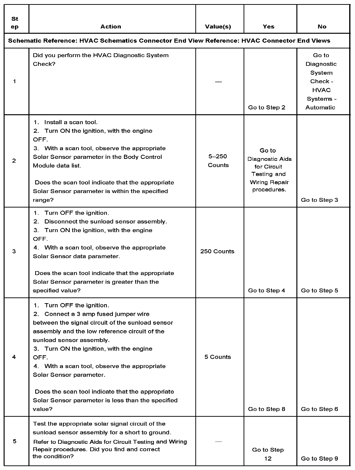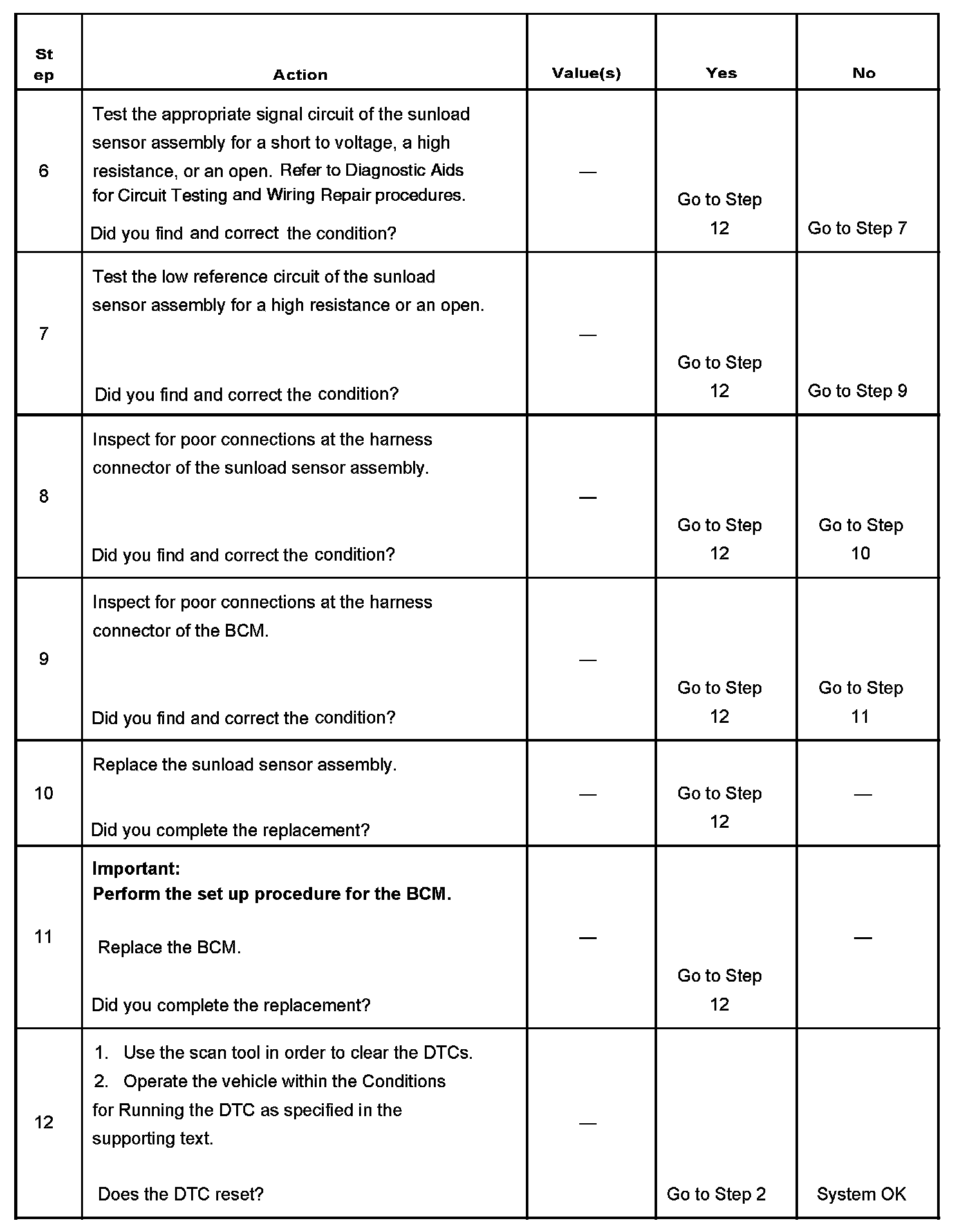 The BCM determines that the value of the sunload sensor signal is less than 5 counts or greater than 250 counts.