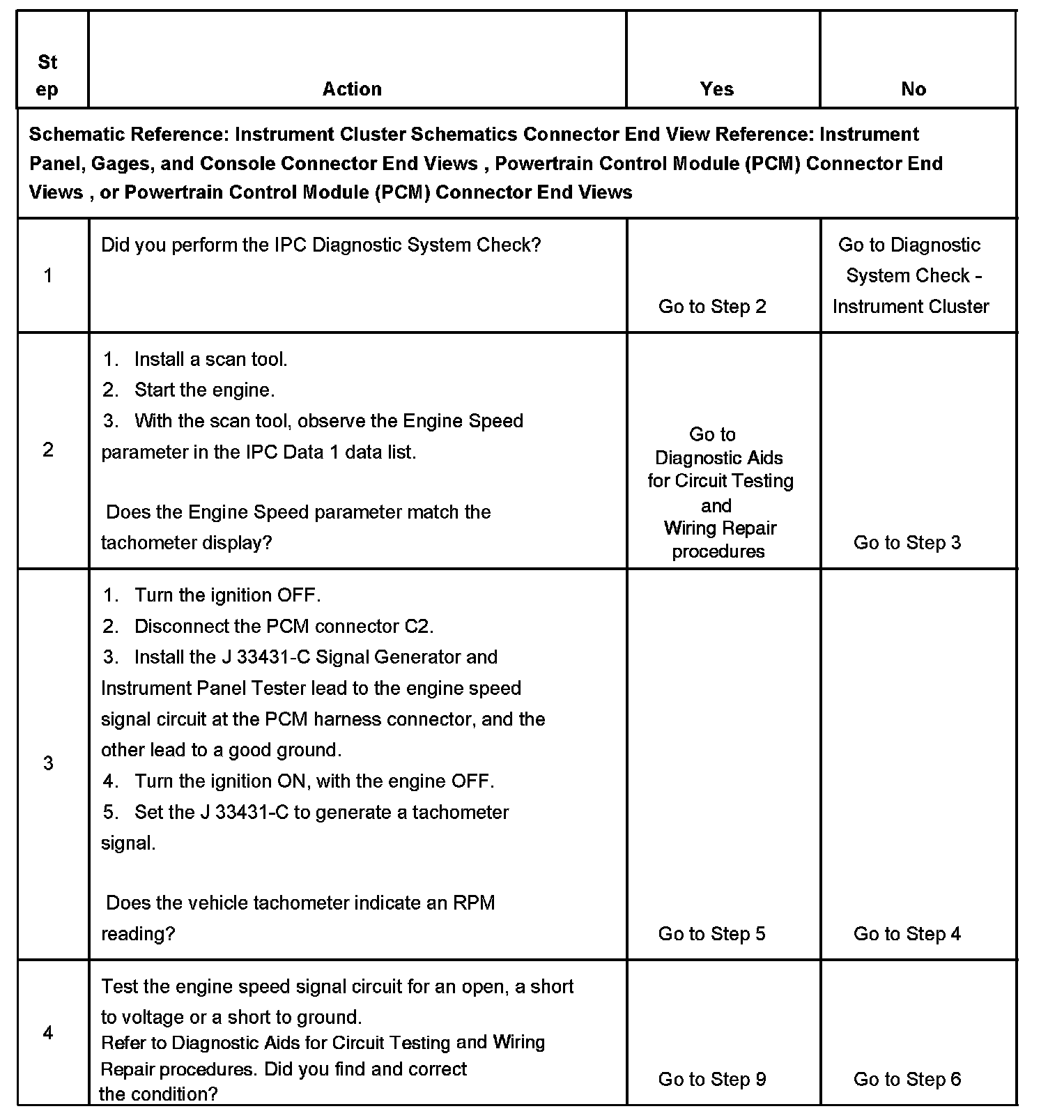 CIRCUIT DESCRIPTIONThe IPC monitors the engine speed signal to determine the tachometer position. If the IPC determines the engine speed signal voltage is out of the normal operating range, a DTC will set.