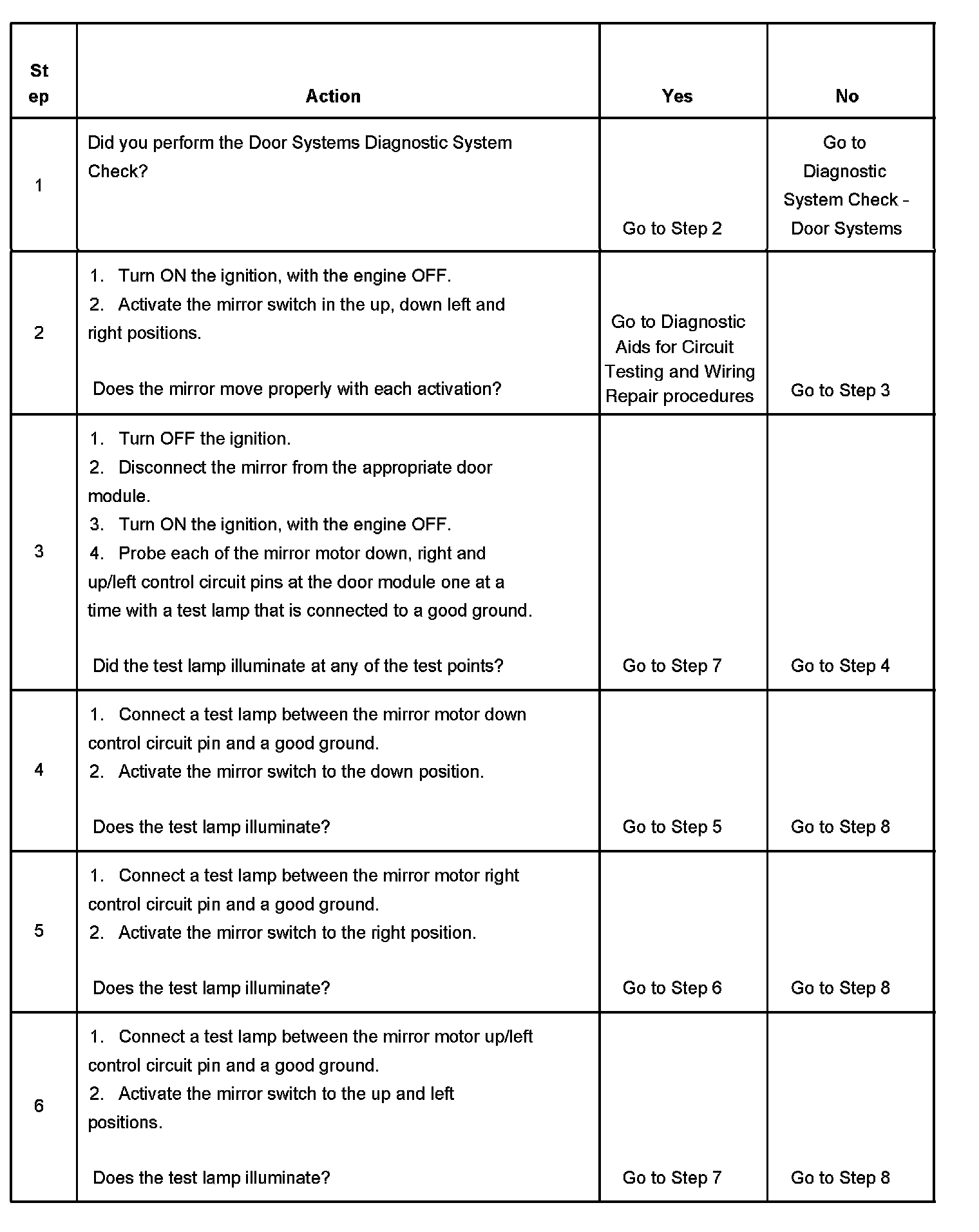 CIRCUIT DESCRIPTIONThe Driver Door and Passenger Door modules supply battery positive voltage and ground on opposing mirror motor control circuits upon receipt of a mirror switch activation or a Class 2 message commanding mirror control, memory recall or mirror tilt in reverse functions.