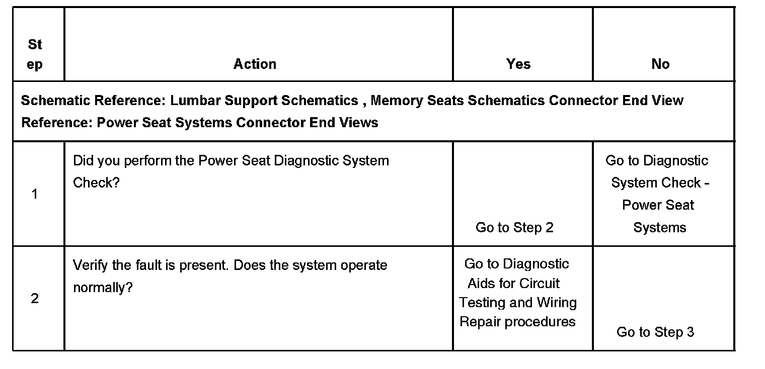 CIRCUIT DESCRIPTIONThe seat adjuster motors are controlled by the driver seat module through the adjuster motor control circuits. In an inactive state both of the motor control circuits are grounded within the driver seat module. In an active state the driver seat module switches the appropriate motor control circuit to battery positive voltage. The direction of the adjuster motor rotation is determined by which of the motor control circuits is switched to battery positive voltage while the other remains grounded. During adjuster motor operation the driver seat module also monitors the current flow through the motor control circuits.