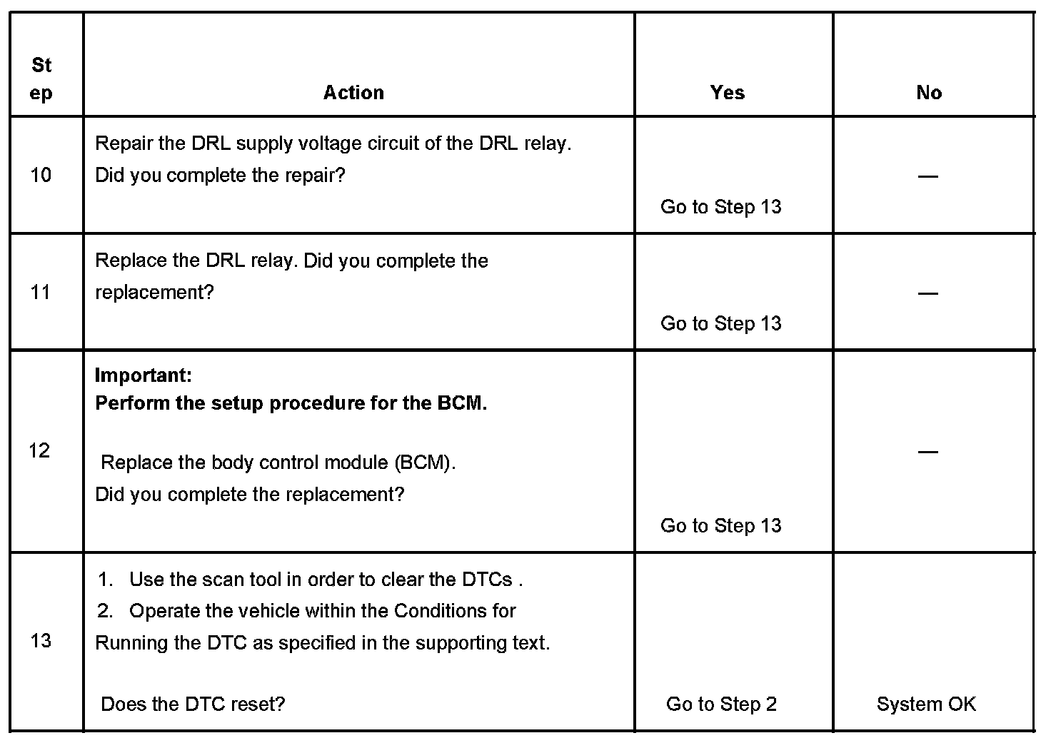- When the BCM sends a DRL OFF command and the DRL relay control circuit is shorted to ground.