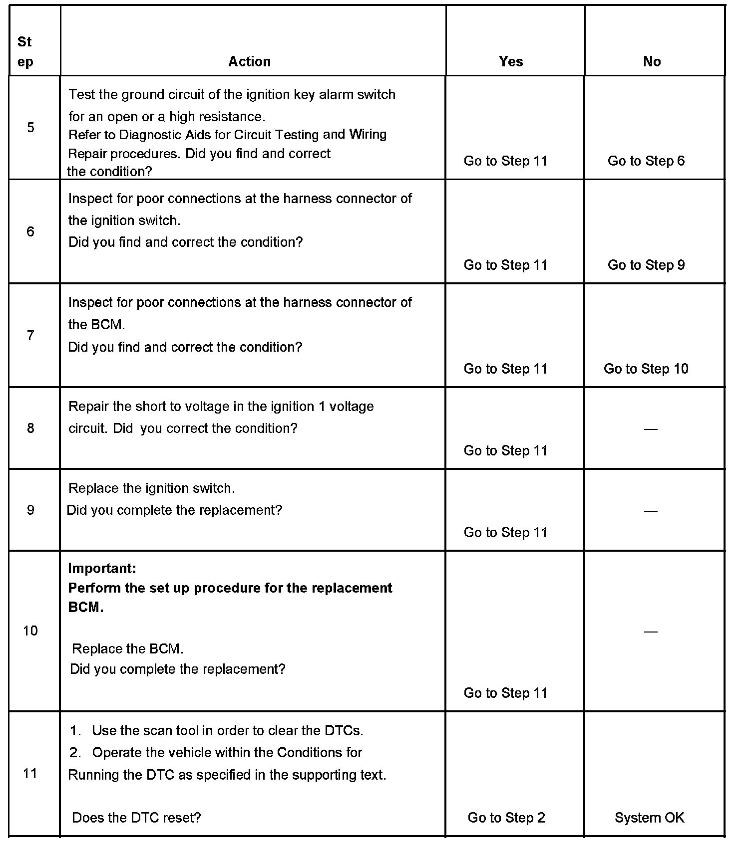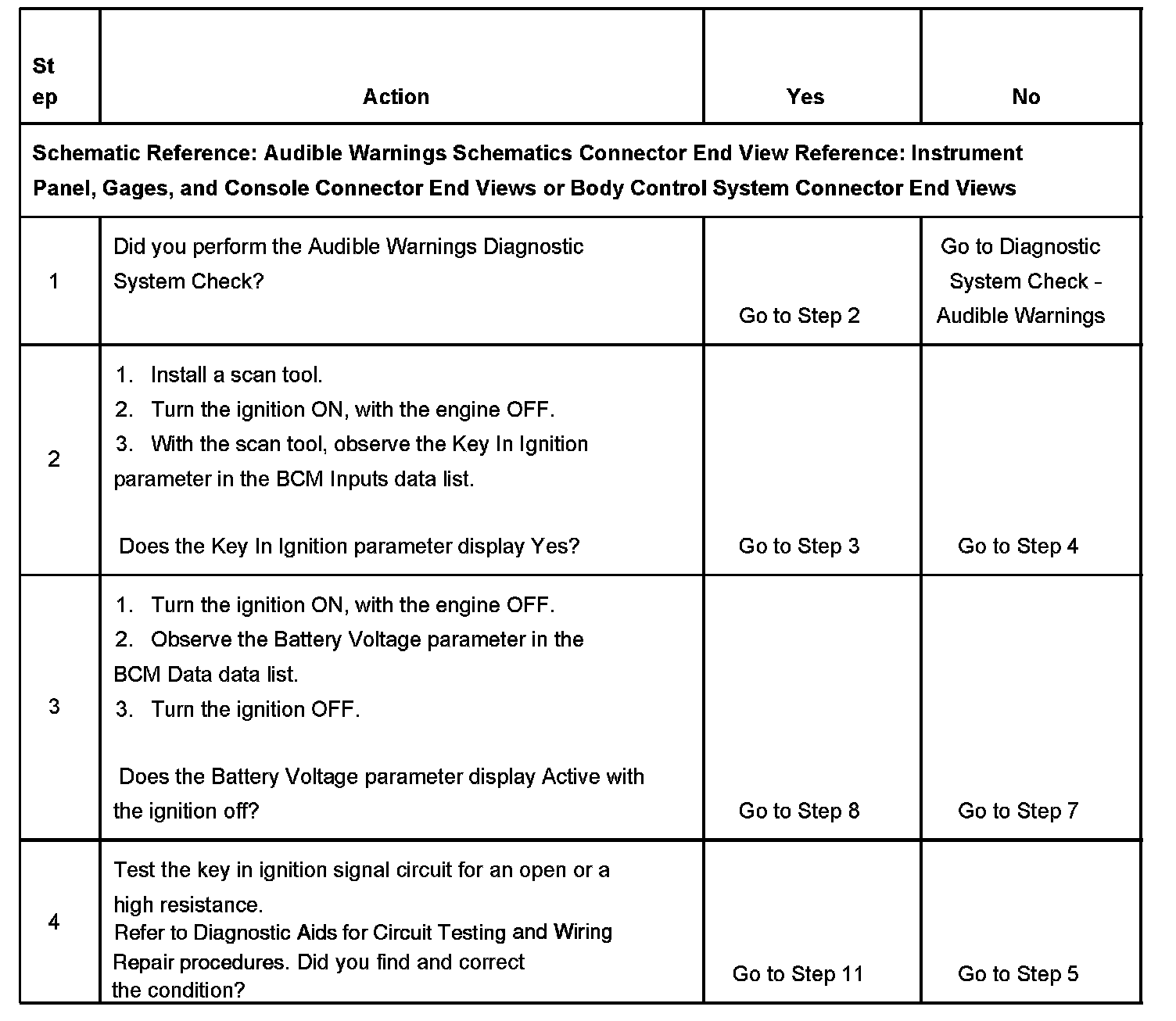 CIRCUIT DESCRIPTIONThe body control module (BCM) monitors the ignition key alarm switch. When the key is in the ignition, the ignition key alarm switch is closed with the signal circuit as low. When the key is not in the ignition, the ignition key alarm switch is open with the signal circuit as high.
