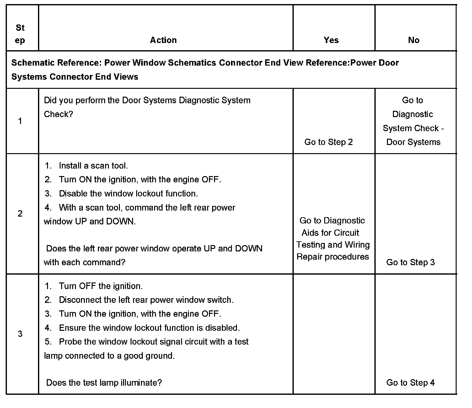CIRCUIT DESCRIPTIONBattery positive voltage is supplied to the left rear power window switch and the up and down relays through the window lockout signal circuit. If the window lockout function is disabled, the BCM supplies battery positive voltage to the switch and relays and the left rear window operates normally. If the window lockout function is enabled, the BCM will not supply battery positive voltage to the switch and relays and the left rear window will be inoperative unless it is operated from the driver power window switch.