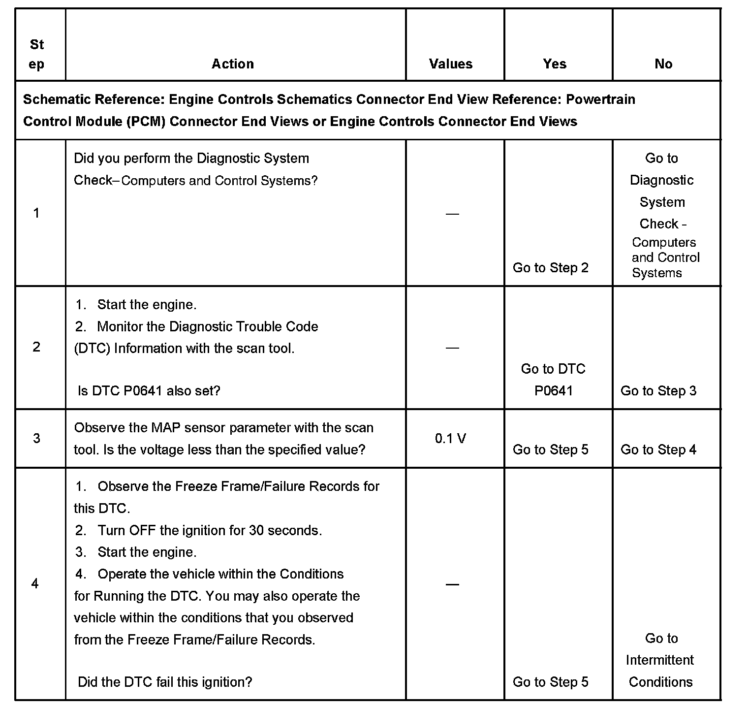 The PCM detects that the MAP sensor voltage is less than 0.10 volt for more than 2 seconds.