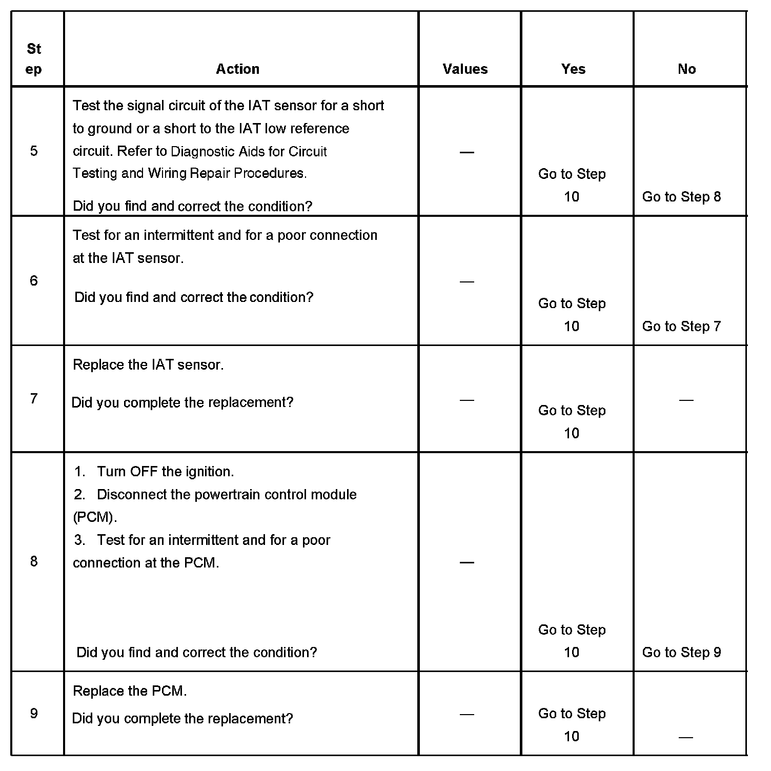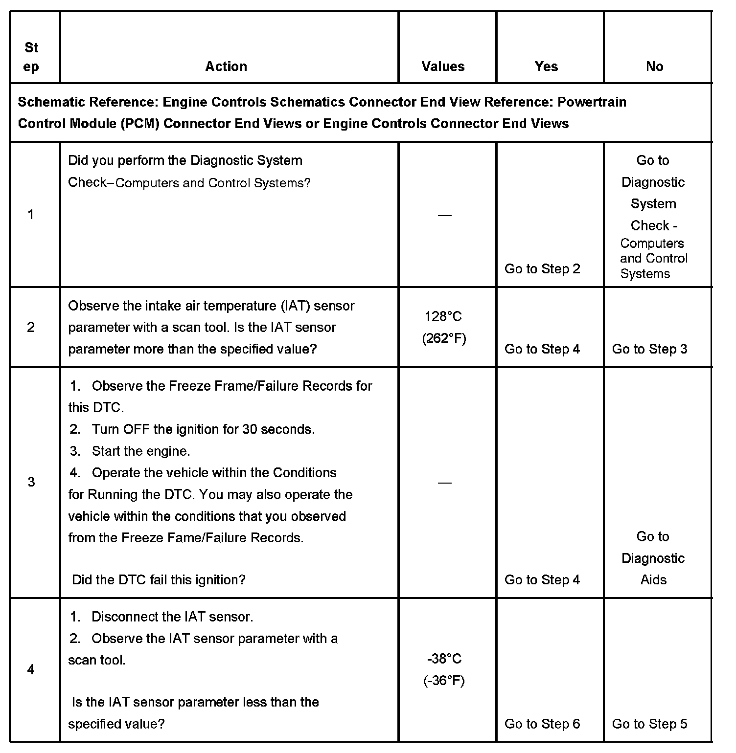 The intake air temperature (IAT) sensor is a variable resistor. The IAT sensor has a signal circuit and a low reference circuit. The IAT sensor measures the temperature of the air entering the engine. The powertrain control module (PCM) supplies 5 volts to the IAT signal circuit and a ground for the IAT low reference circuit. When the IAT sensor is cold, the sensor resistance is high. When the air temperature increases, the sensor resistance decreases. With high sensor resistance, the PCM detects a high voltage on the IAT signal circuit. With lower sensor resistance, the PCM detects a lower voltage on the IAT signal circuit. If the PCM detects an excessively low IAT signal voltage, indicating a high temperature, DTC P0112 sets.