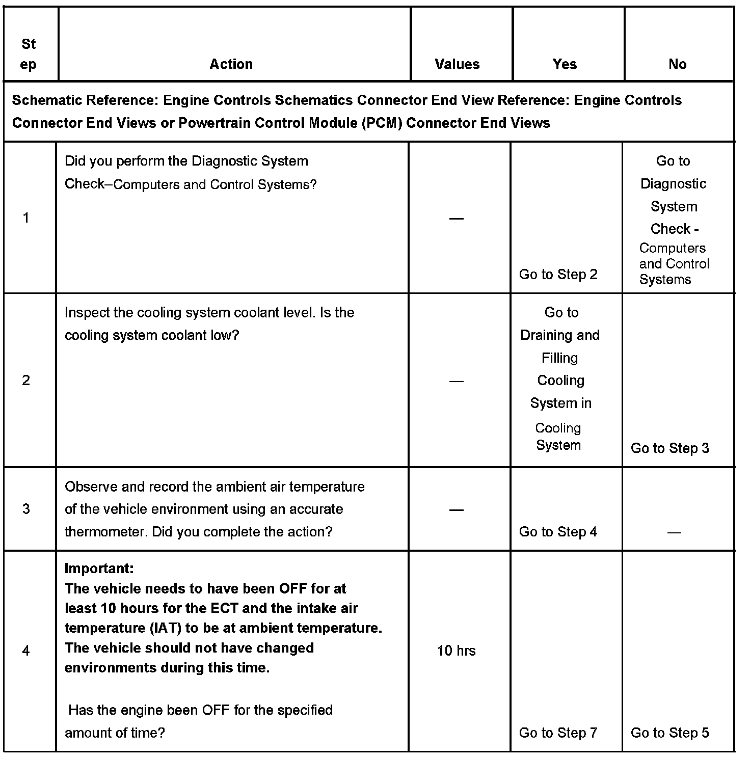 The numbers below refer to the step numbers on the diagnostic table.