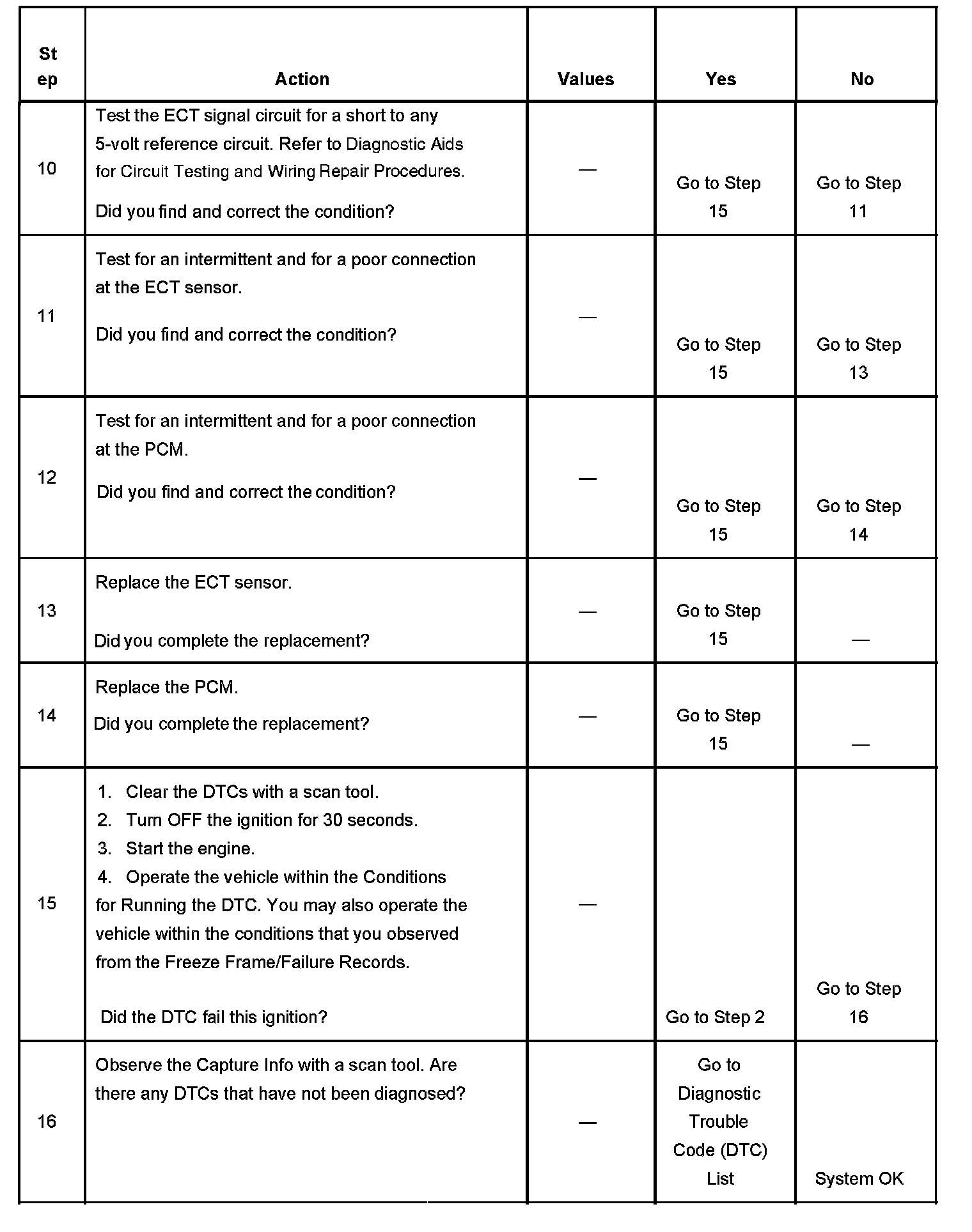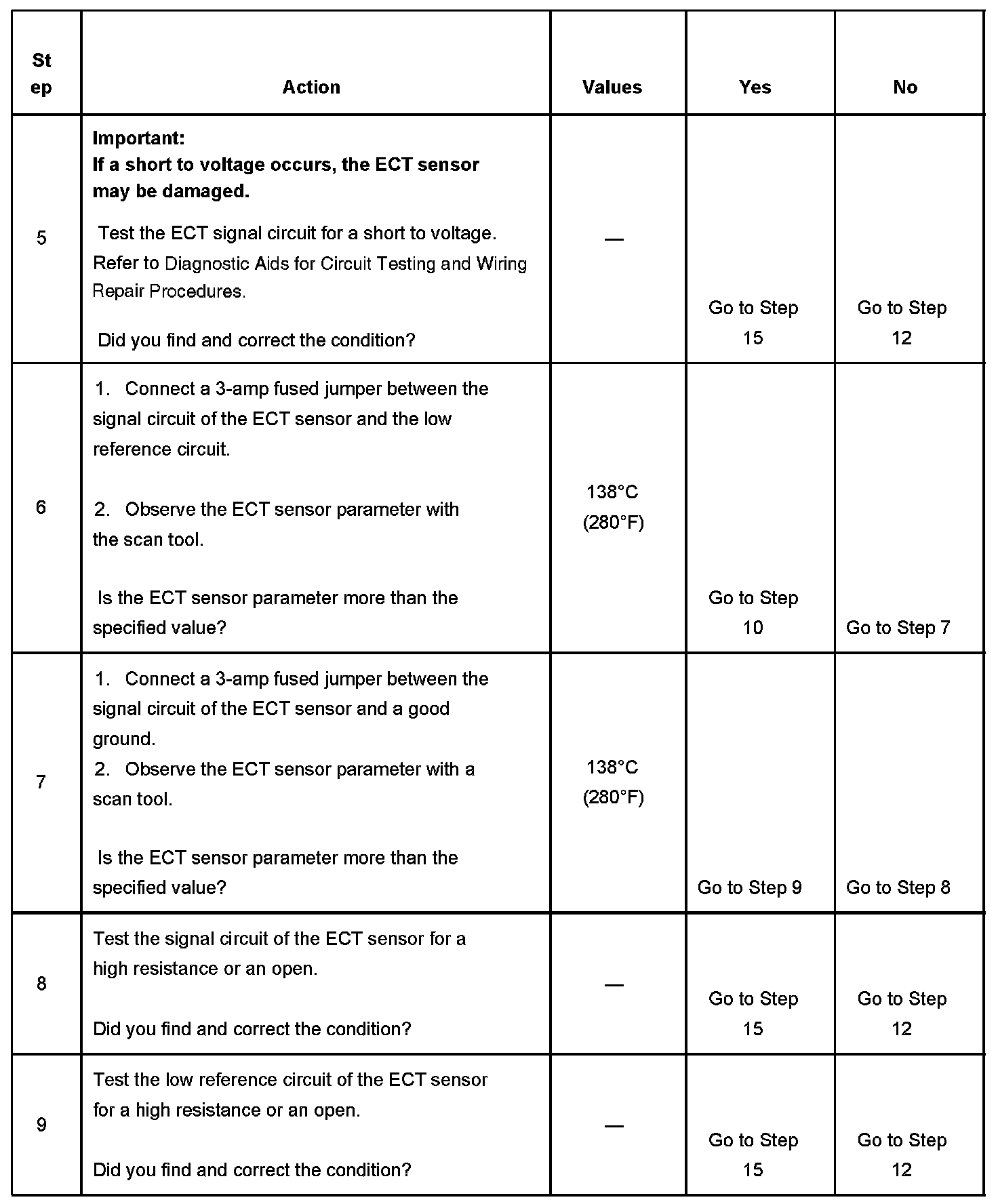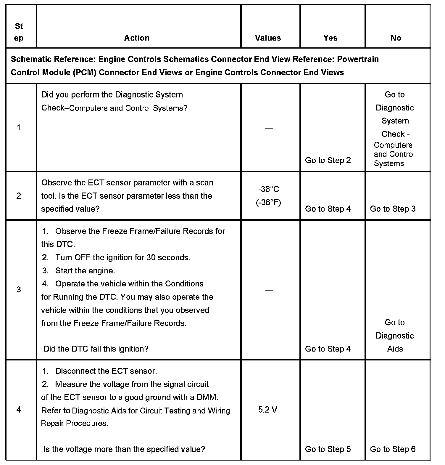 CIRCUIT DESCRIPTIONThe engine coolant temperature (ECT) sensor is a variable resistor, that measures the temperature of the engine coolant. The ECT sensor has a signal circuit and a low reference circuit. The powertrain control module (PCM) supplies 5 volts to the ECT signal circuit and a ground for the ECT low reference circuit. When the ECT is cold, the sensor resistance is high. When the ECT increases, the sensor resistance decreases. With high sensor resistance, the PCM detects a high voltage on the ECT signal circuit. With lower sensor resistance, the PCM detects a lower voltage on the ECT signal circuit. If the PCM detects an excessively high ECT signal voltage, which is a low temperature indication, DTC P0118 sets.