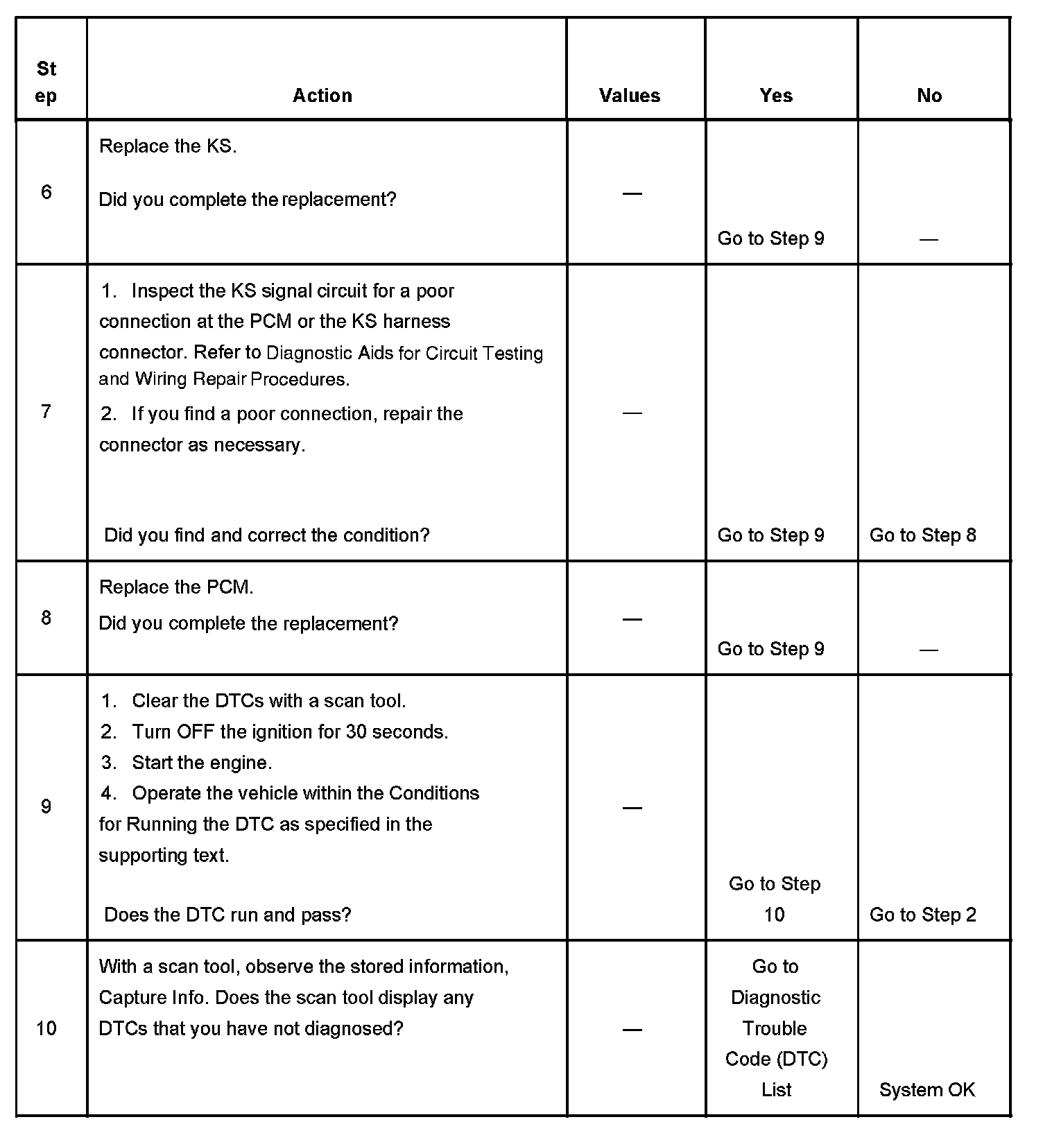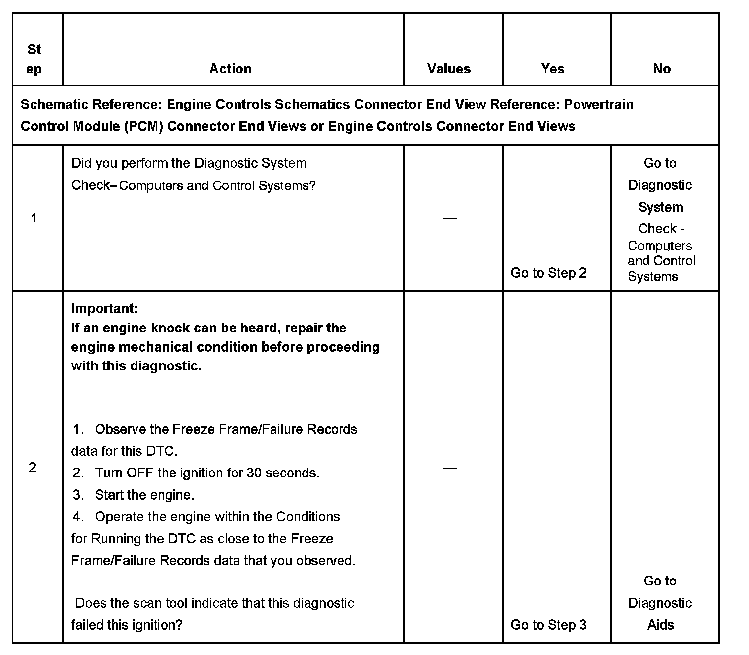 The numbers below refer to the step numbers on the diagnostic table.
