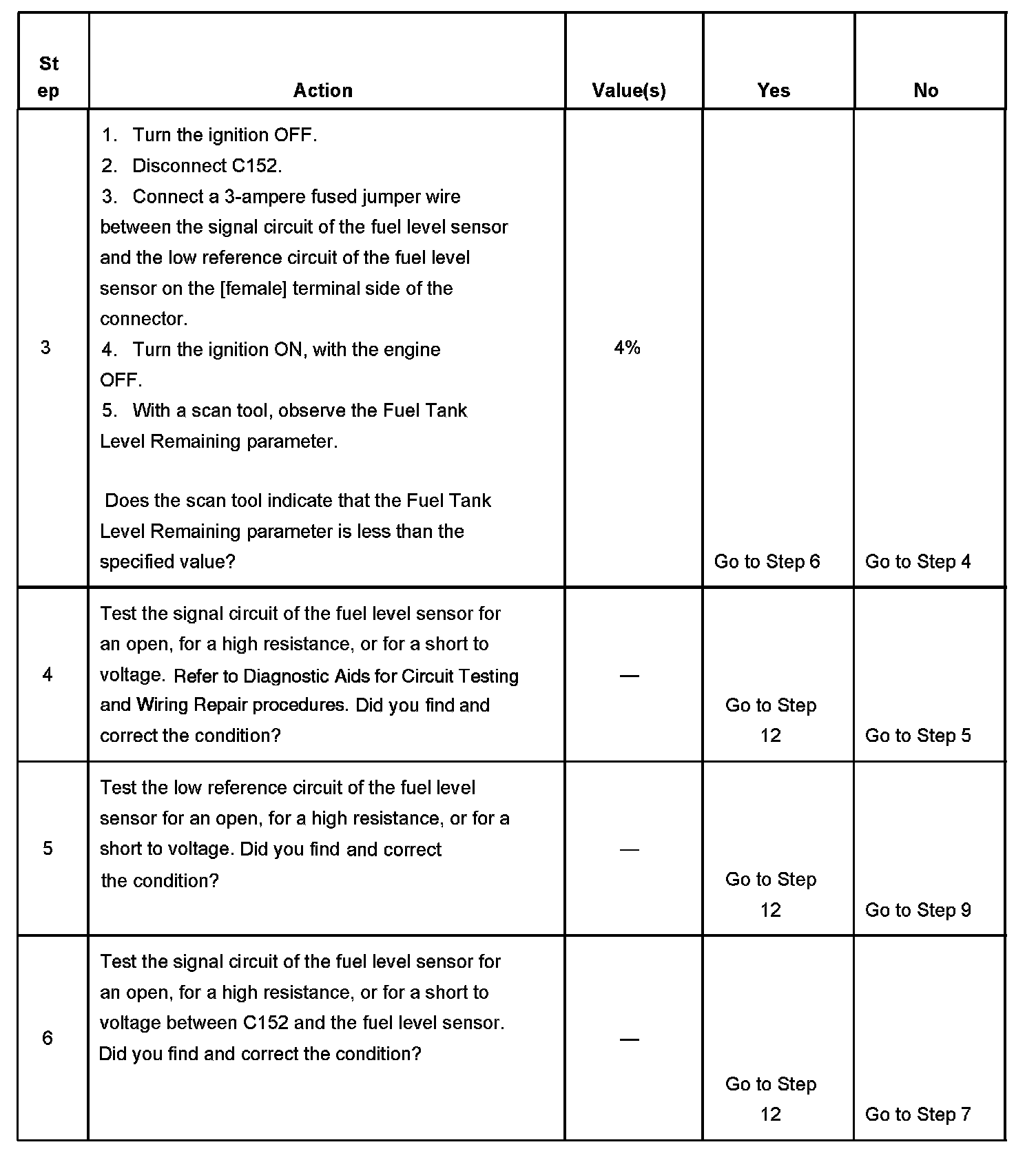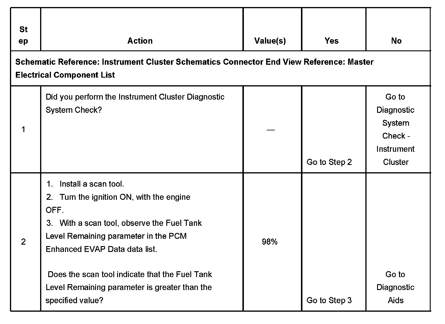 CIRCUIT DESCRIPTIONThe fuel level sensor changes resistance in response to fuel level. The PCM monitors the signal circuit of the fuel level sensor in order to determine the fuel level. When the fuel tank is full, the sensor resistance is high and the PCM senses a high signal voltage. When the fuel tank is empty, the sensor resistance is low and the PCM senses a low signal voltage. The PCM uses the signal circuit of the fuel level sensor in order to calculate the percentage of remaining fuel in the tank. The PCM sends the fuel level percentage via the class 2 serial data circuit to the instrument cluster in order to control the fuel gage. The fuel level information is also used for misfire and EVAP diagnostics.