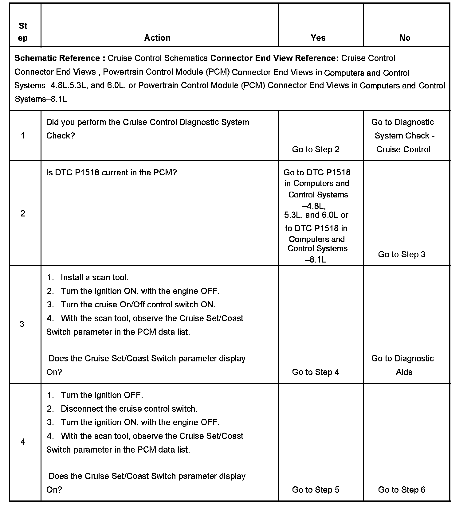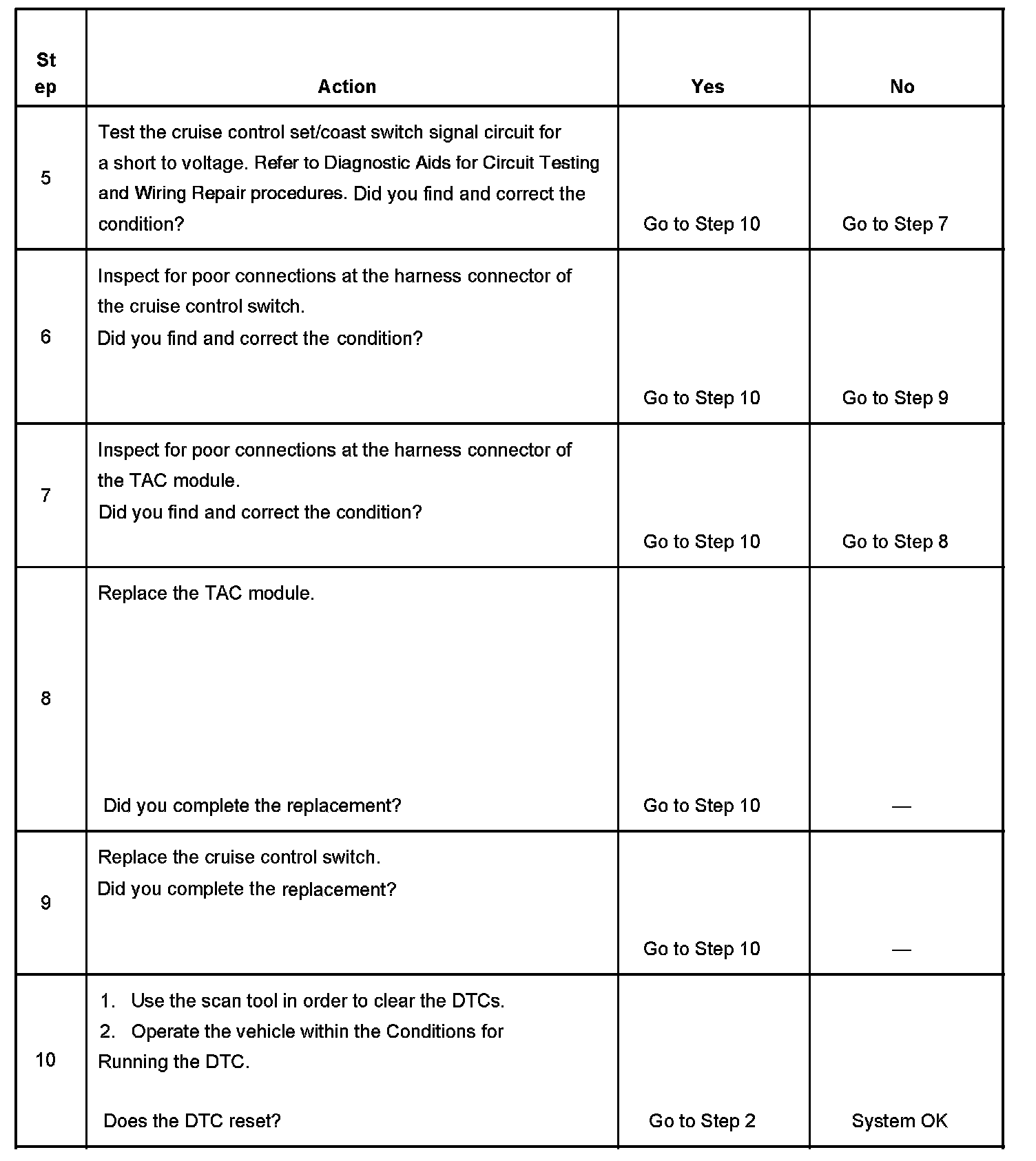 CIRCUIT DESCRIPTIONThe cruise control Set/Coast switch is an input to the throttle actuator control (TAC) module. The TAC module uses the cruise control set/coast switch signal circuit in order to detect when the driver has requested to set the vehicle speed or to decelerate the vehicle speed. The TAC module detects a voltage signal on the cruise control set/coast switch signal circuit when the switch is applied. The TAC module sends a serial data signal to the PCM via the UART serial data circuit. This DTC sets if the PCM receives a serial data signal from the TAC module indicating that voltage is present on the cruise control set/coast switch signal circuit for longer than 90 seconds.