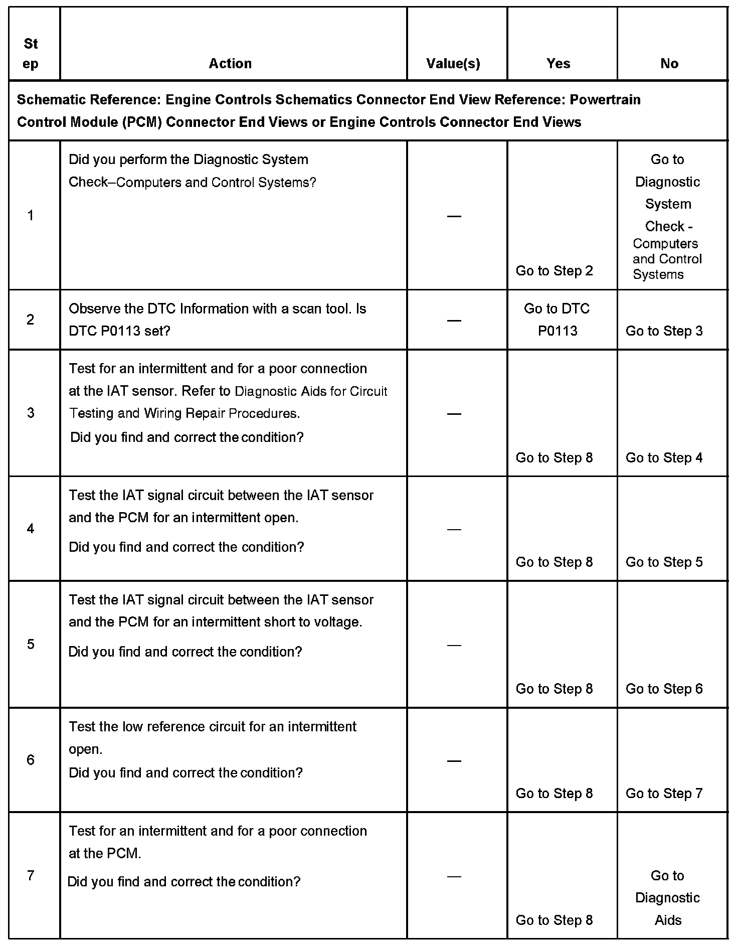 CIRCUIT DESCRIPTIONThe intake air temperature (IAT) sensor is a variable resistor. The IAT sensor has a signal circuit and a low reference circuit. The IAT sensor measures the temperature of the air entering the engine. The powertrain control module (PCM) supplies 5 volts to the IAT signal circuit and a ground for the IAT low reference circuit. When the IAT sensor is cold, the sensor resistance is high. When the air temperature increases, the sensor resistance decreases. With high sensor resistance, the PCM detects a high voltage on the IAT signal circuit. With lower sensor resistance, the PCM detects a lower voltage on the IAT signal circuit. If the PCM detects an intermittent high IAT signal voltage, indicating a low temperature, DTC P1111 sets.