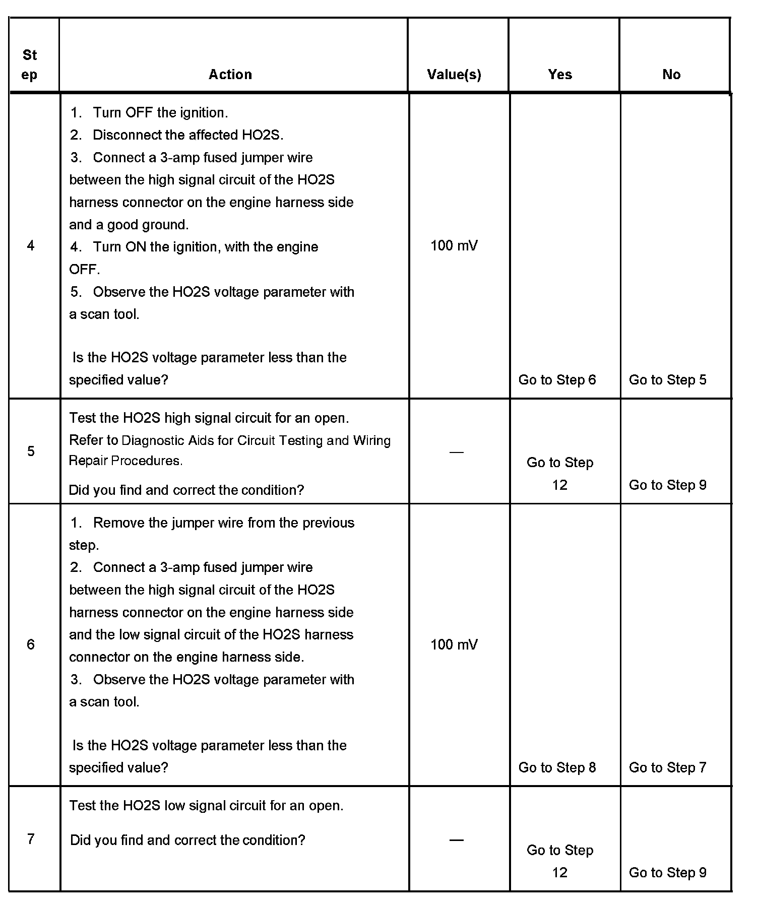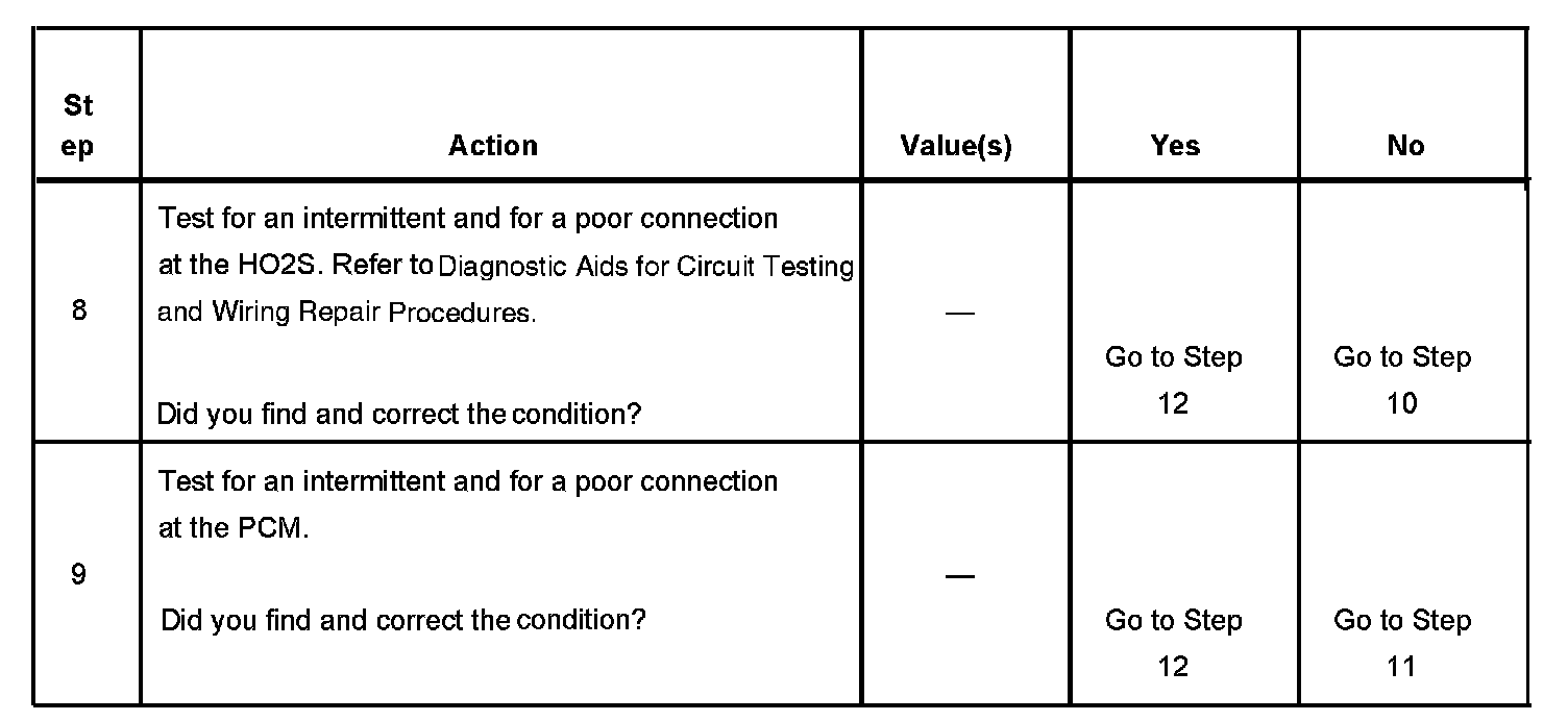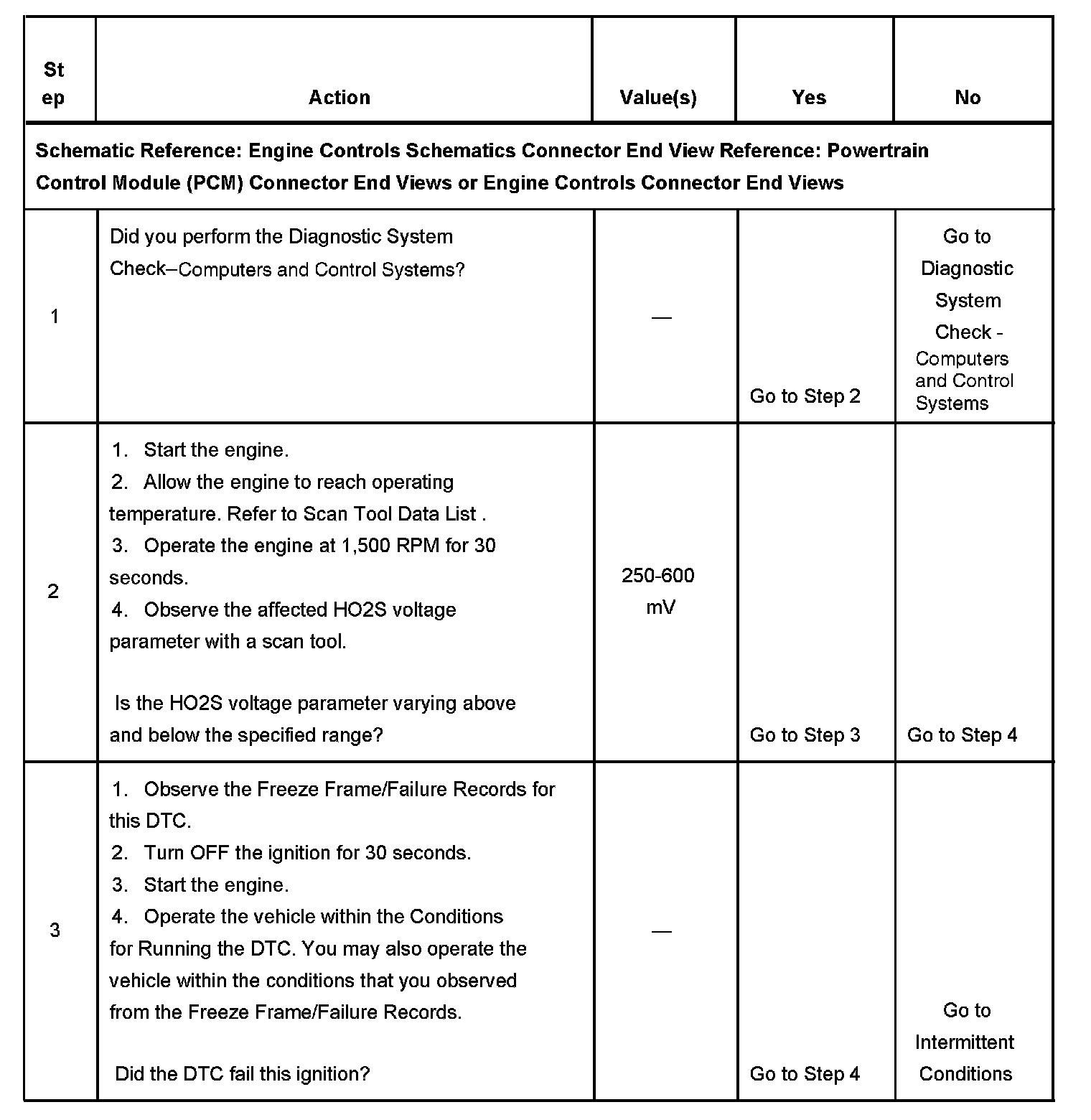 CIRCUIT DESCRIPTIONHeated oxygen sensors (HO2S) are used for fuel control and post catalyst monitoring. Each HO2S compares the oxygen content of the surrounding air with the oxygen content in the exhaust stream. The HO2S must reach operating temperature to provide an accurate voltage signal. Heating elements inside the HO2S minimize the time required for the sensors to reach operating temperature. The powertrain control module (PCM) supplies the HO2S with a reference, or bias, voltage of about 450 mV. When the engine is first started the PCM operates in open loop, ignoring the HO2S voltage signal. Once the HO2S reaches operating temperature and closed loop is achieved, the HO2S generates a voltage within a range of 0-1,000 mV that fluctuates above and below bias voltage. High HO2S voltage indicates a rich exhaust stream; low HO2S voltage indicates a lean exhaust stream. This diagnostic will only run once per ignition cycle. The PCM monitors the number of rich-to-lean and lean-to-rich transitions. A transition is defined as, the HO2S voltage changes from above 600 mV to below 250 mV or from below 250 mV to above 600 mV. If the PCM detects that the number of transitions were less than a specified value, DTCs P1133 or P1153 will set.