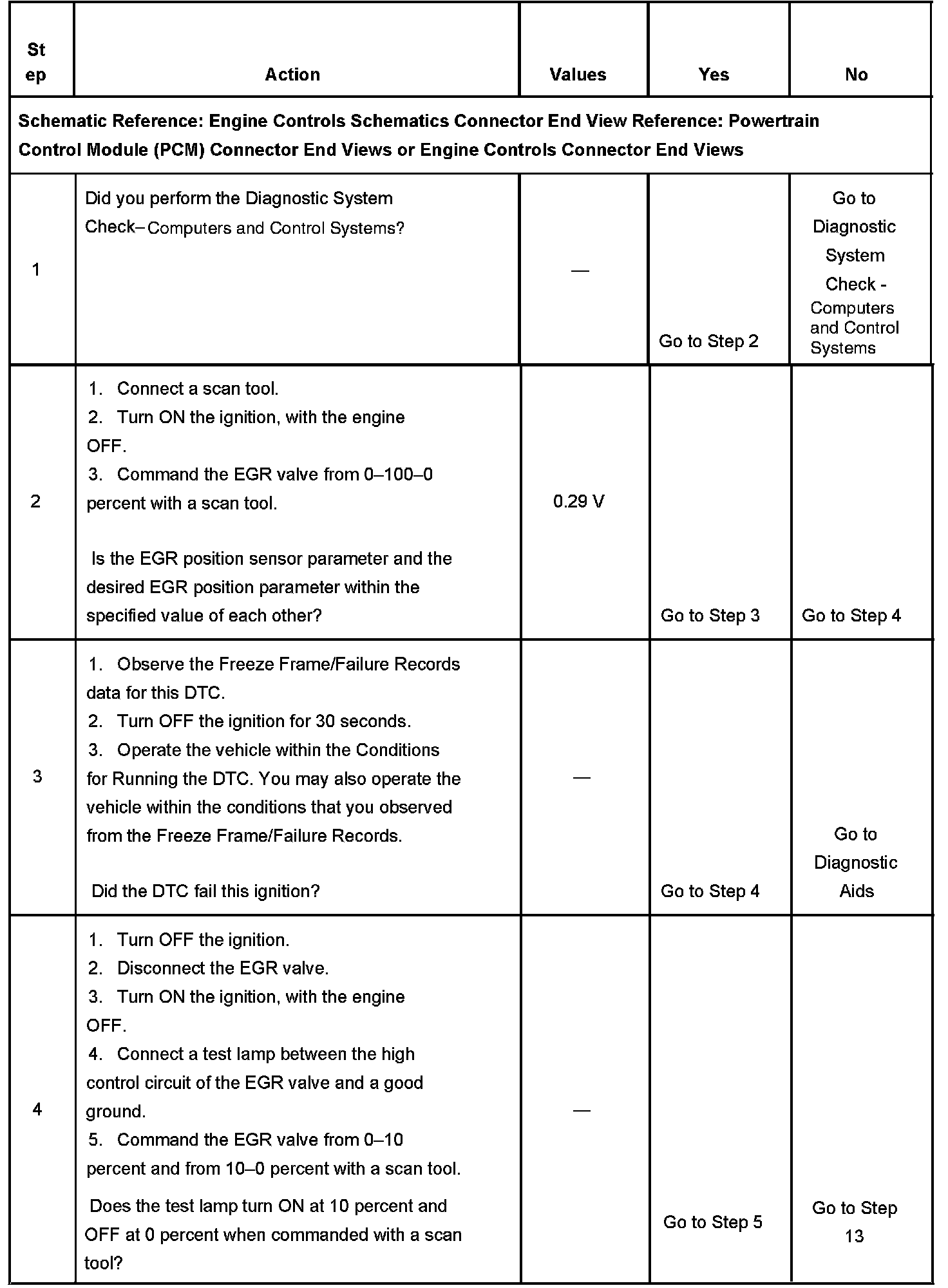 - The EGR position sensor parameter is 0.29 volts more than the EGR learned minimum position when the desired EGR position parameter is commanded to 0 percent for more than 2 seconds.