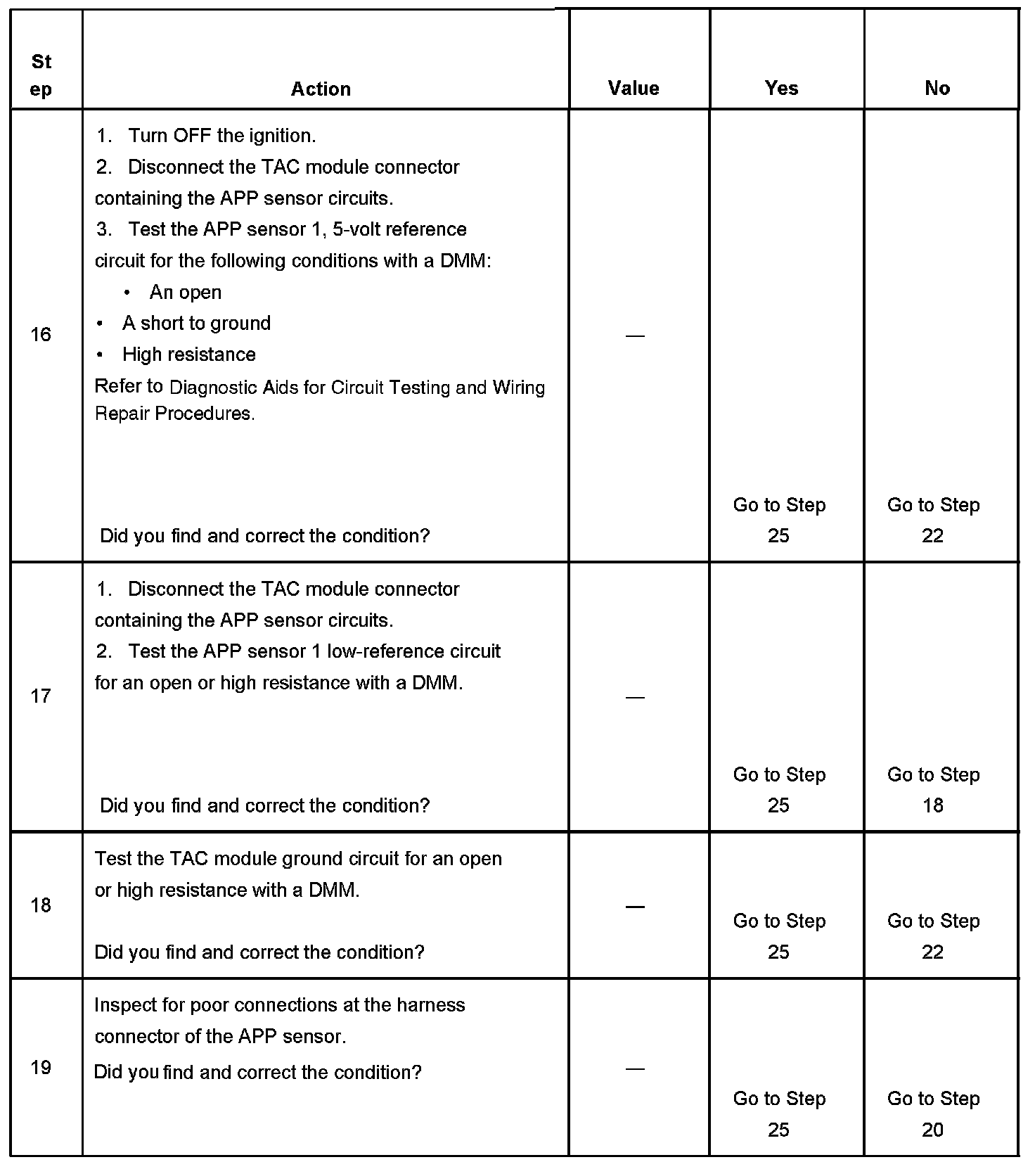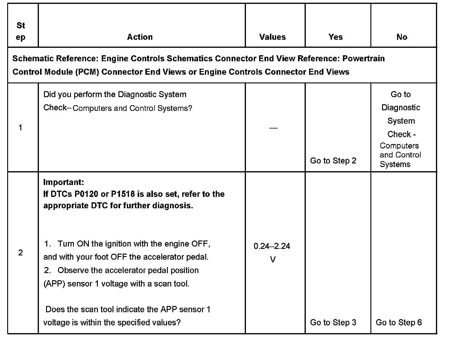 The control module provides the APP sensor a 5-volt reference circuit and a low reference circuit. The APP sensor then provides the control module a signal voltage proportional to pedal movement. The APP sensor 1 signal voltage is low at rest and increases as the pedal is depressed. When the control module detects that the APP sensor 1 signal or APP sensor 5-volt reference voltage is outside the predetermined range, this DTC sets.