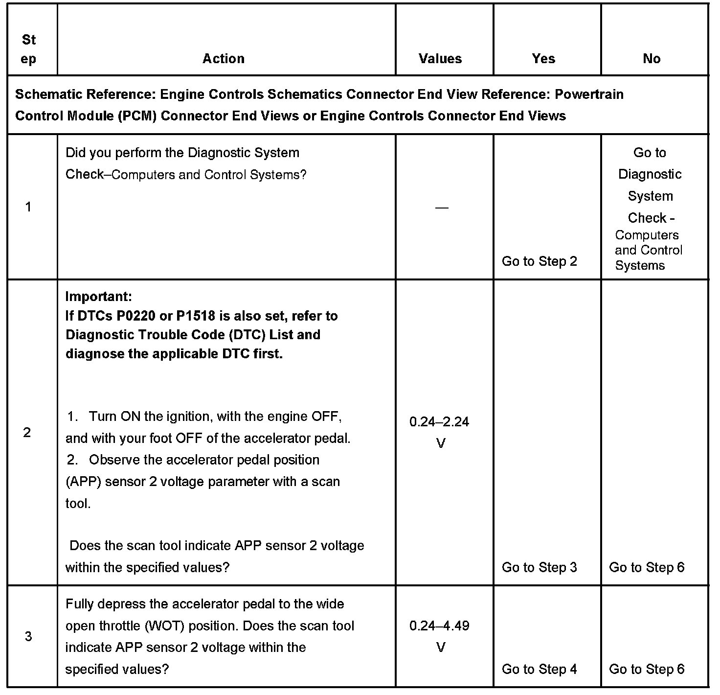 2. The throttle position (TP) sensor 2 and the APP sensor 2 share a common 5-volt reference source. Diagnose DTC P0220 first if P0220 is also set.