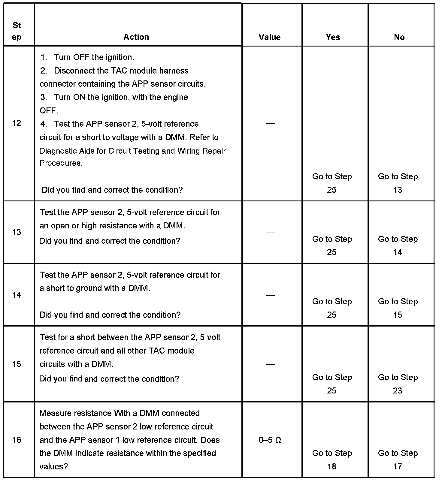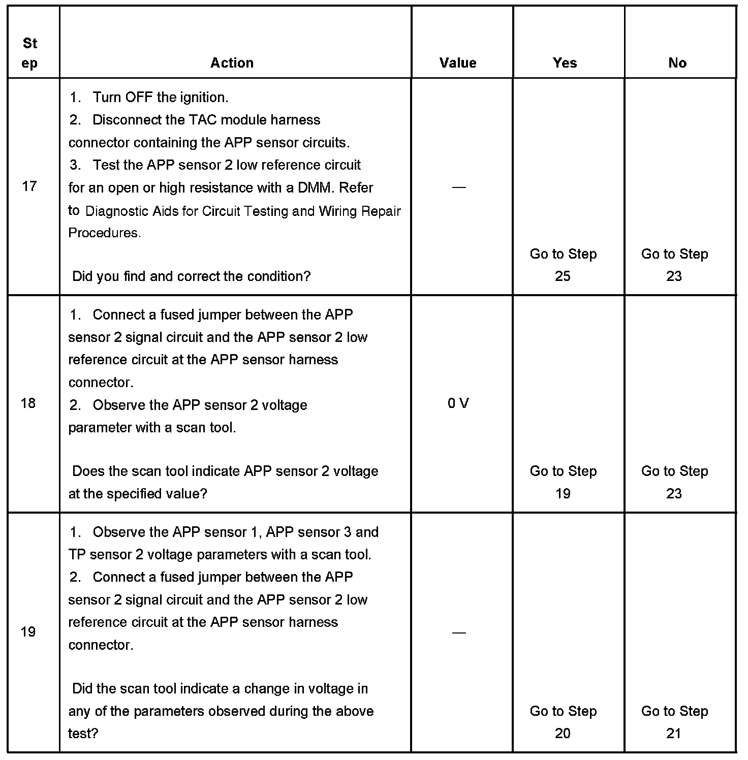 19. There are 2 separate 5-volt reference sources within the TAC module. The TP sensor 1 and the APP sensor 1 share one 5-volt reference source. The TP sensor 2 and the APP sensor 2 share another common 5-volt reference source. This test determines whether the signal circuit is shorted to any one of the 5-volt reference circuits. If a short exists, the corresponding sensor voltage will be pulled low.