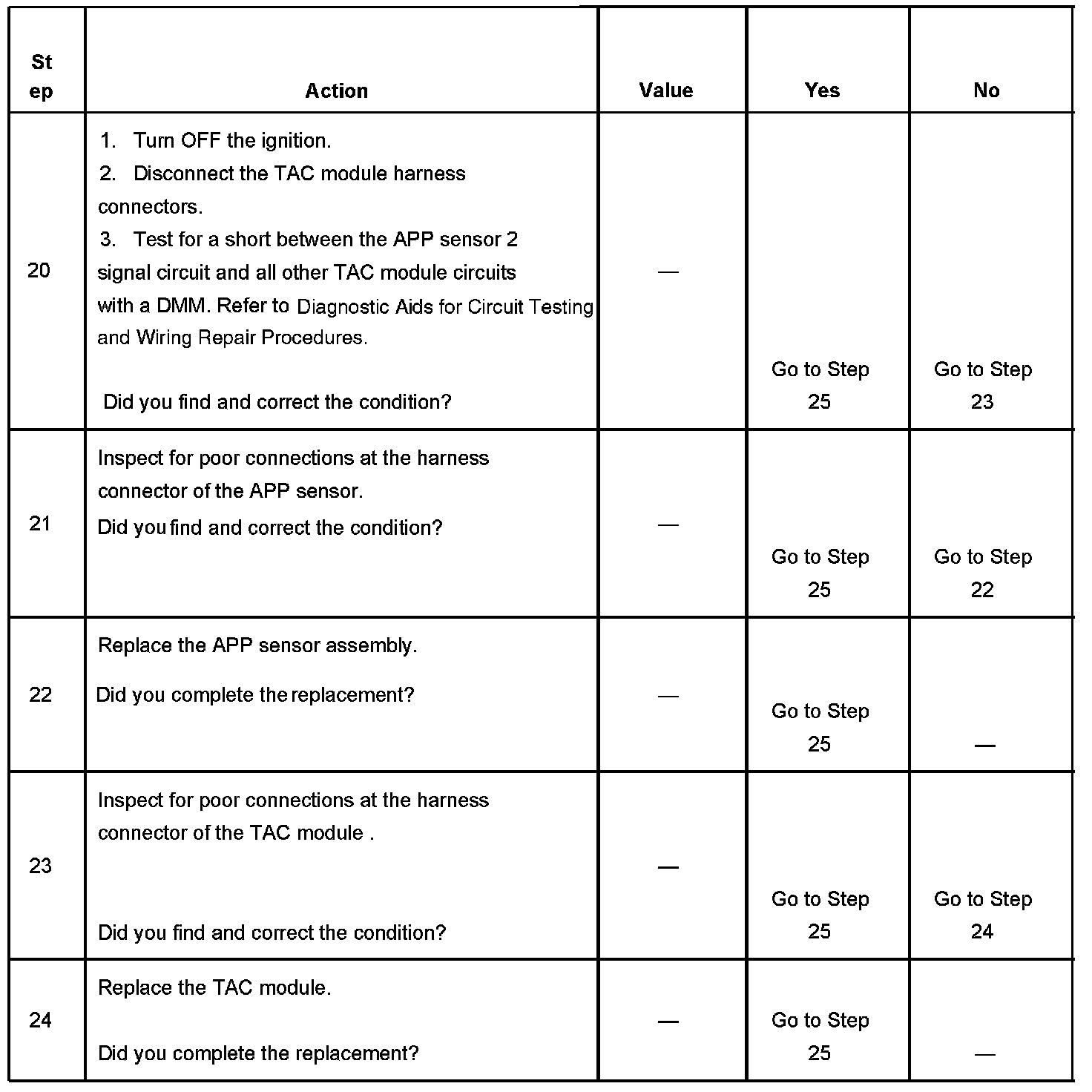 20. The previous step found the signal circuit and a 5-volt reference circuit shorted together. This test isolates whether the short is in the harness or within the TAC module.