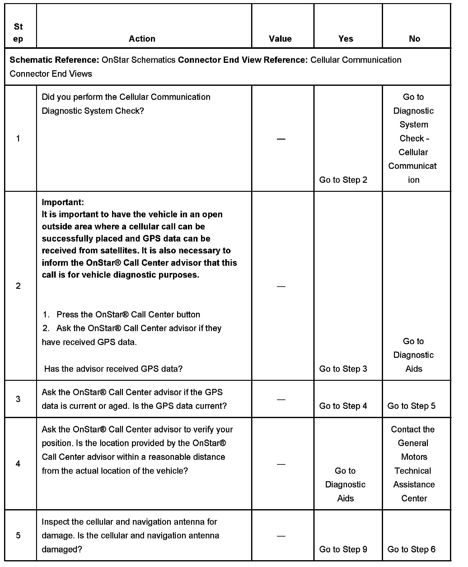 DIAGNOSTIC AIDS- If the OnStar(r) Call Center has not received any GPS data, this is an indication that the OnStar(r) call was a fail to voice and may be due to a failure in the National Cellular Network infrastructure. If this occurs, contact the General Motors Technical Assistance Center.