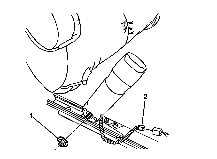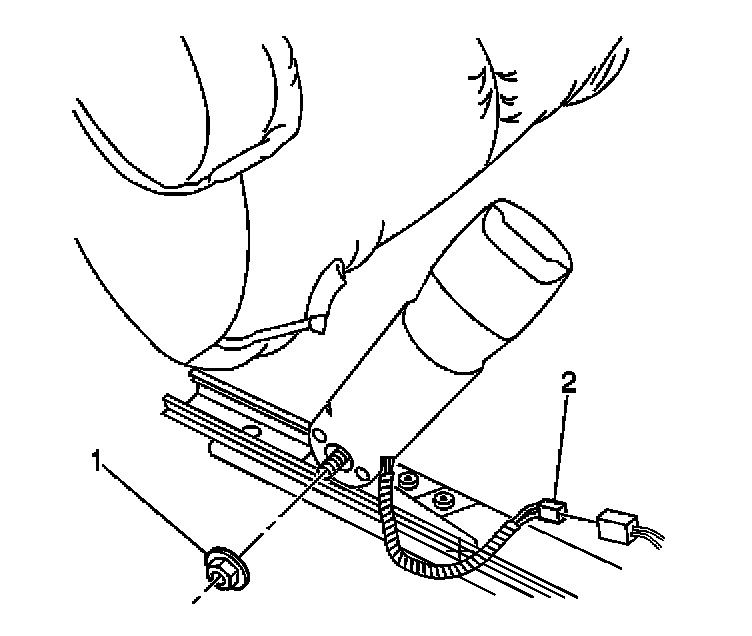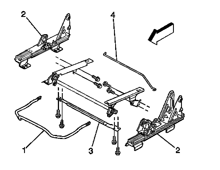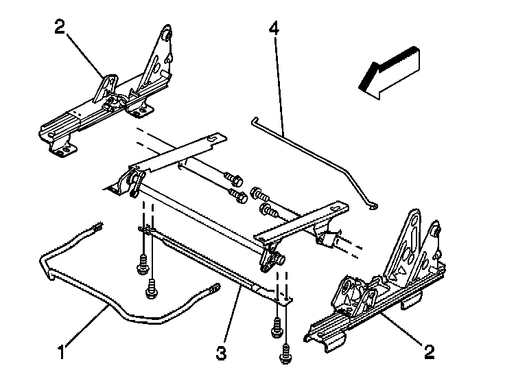 8. Remove the bar (1) from the adjuster tracks (2). Straighten the tabs in order to remove the bar.