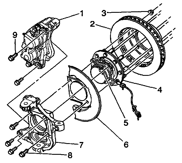 2. Remove the tire and wheel. Refer to Tire and Wheel Removal and Installation in Tires and Wheels.