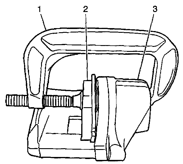 Insert a discarded inner brake pad (2) or block of wood in front of the pistons. Using 2 large C-clamps (1) installed over the body of the caliper (3) and against the brake pad or block of wood, slowly bottom the pistons evenly into the bores.