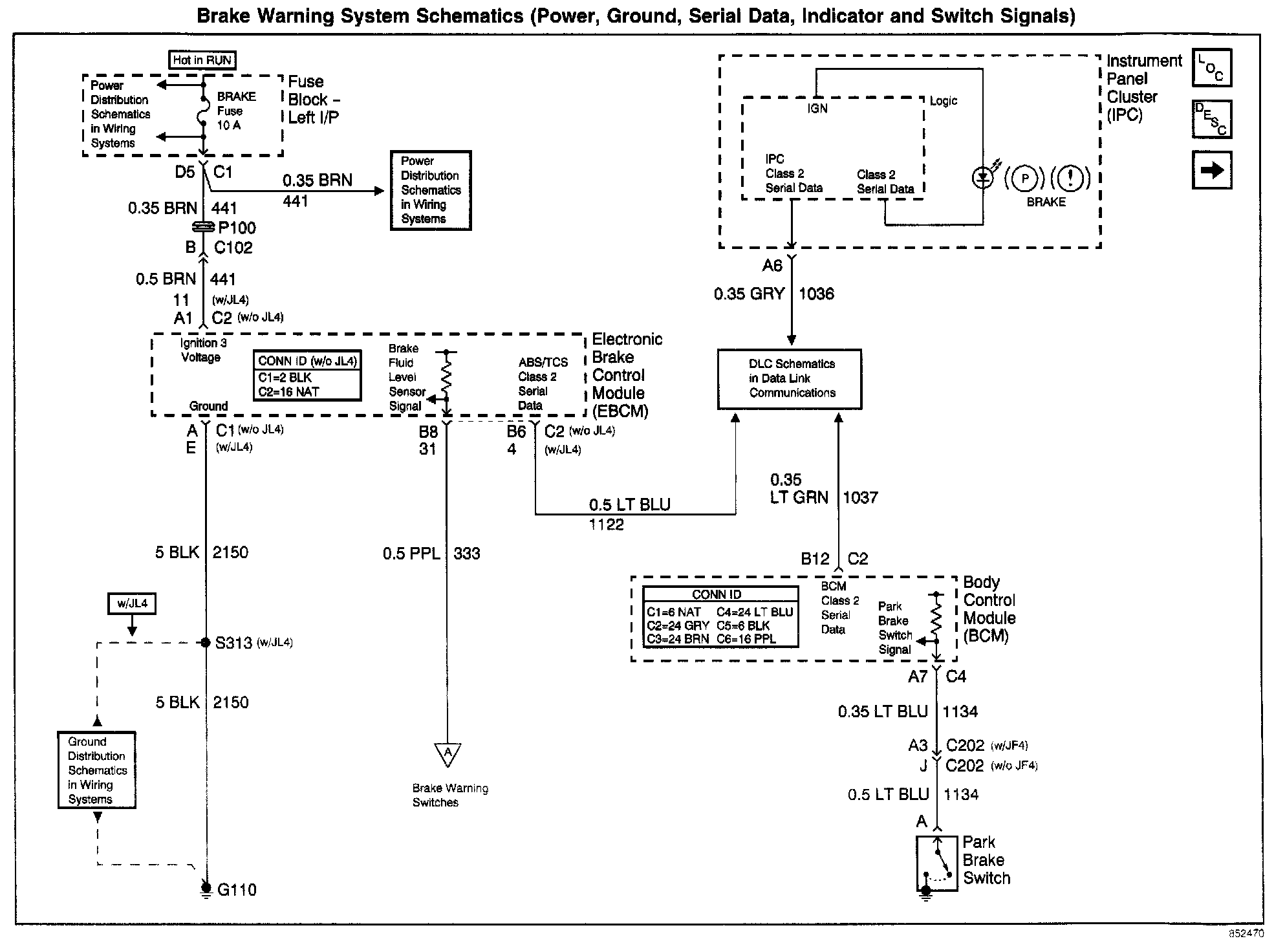 Brake Warning System Schematics (Power, Ground, Serial Data, Indicator And Switch Signals):
