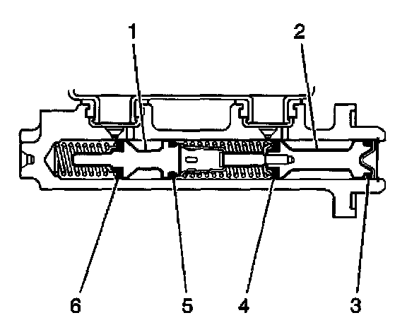 8. If the brake pedal apply did not feel spongy, and the brake pedal travel was initially steady and not excessive, but then gradually fell, then the master cylinder requires overhaul or replacement due to an internal leak past the secondary piston (1) from the secondary piston primary seal (6) or secondary (5).