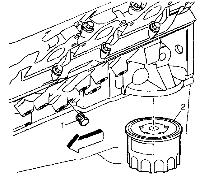 4. Remove the oil filter (2) from the engine block and allow the engine oil to drain completely.