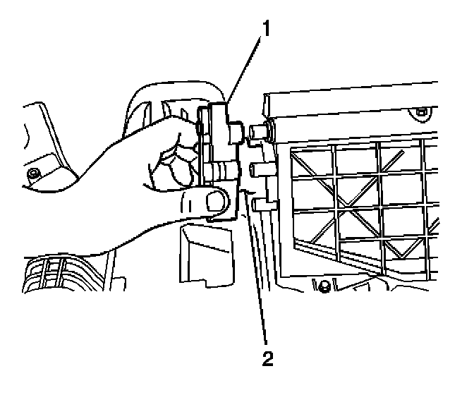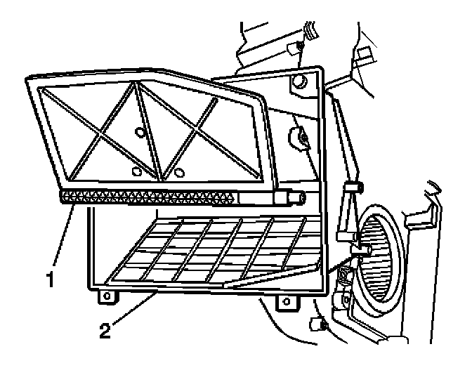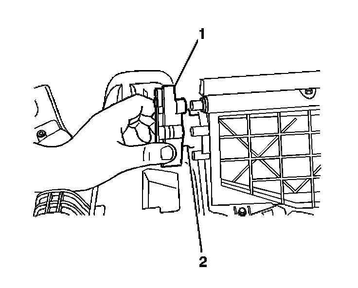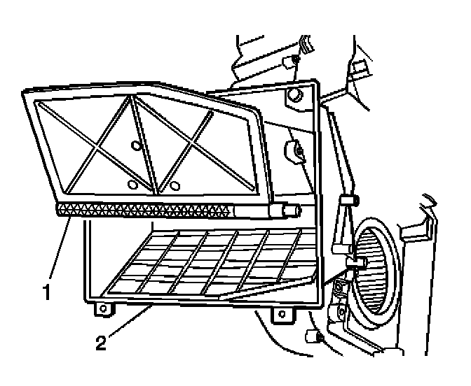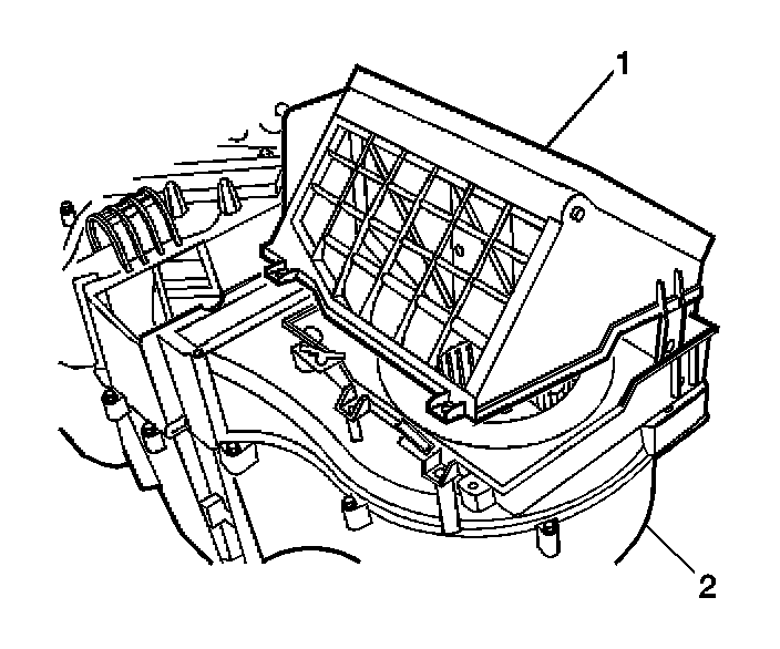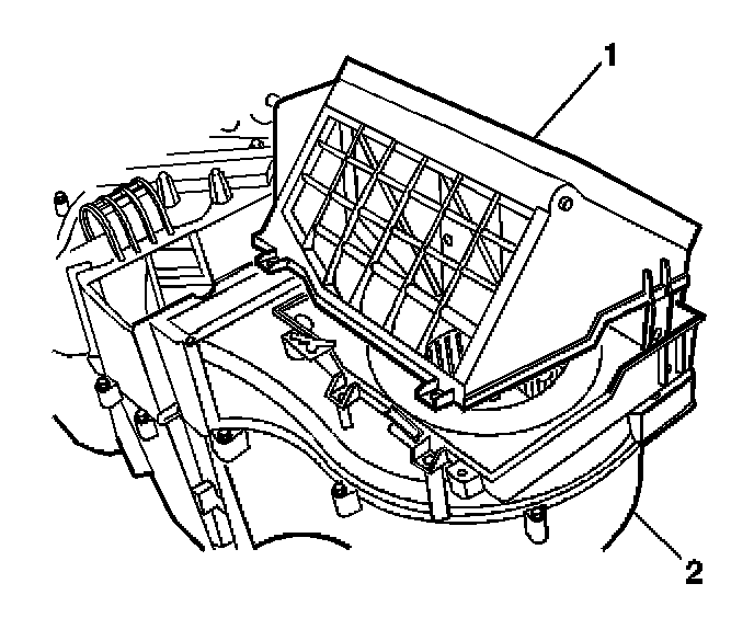 4. Remove the upper recirculation housing (1) from the HVAC module assembly (2).