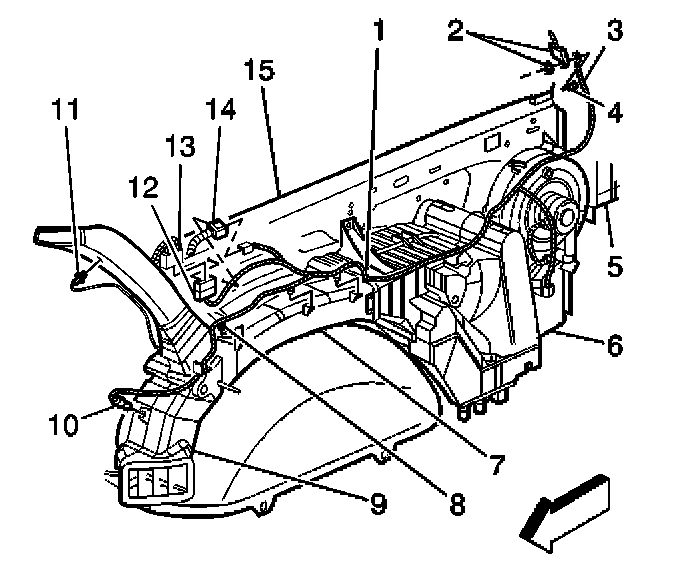 1. Install the rear upper A/C temperature sensor (11) to the air distribution duct.