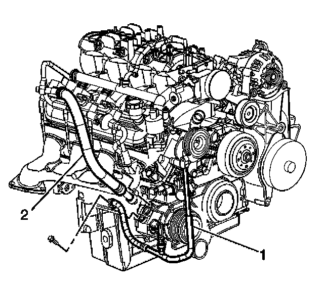 2. Remove the discharge hose mounting bolt (2) from the A/C compressor.