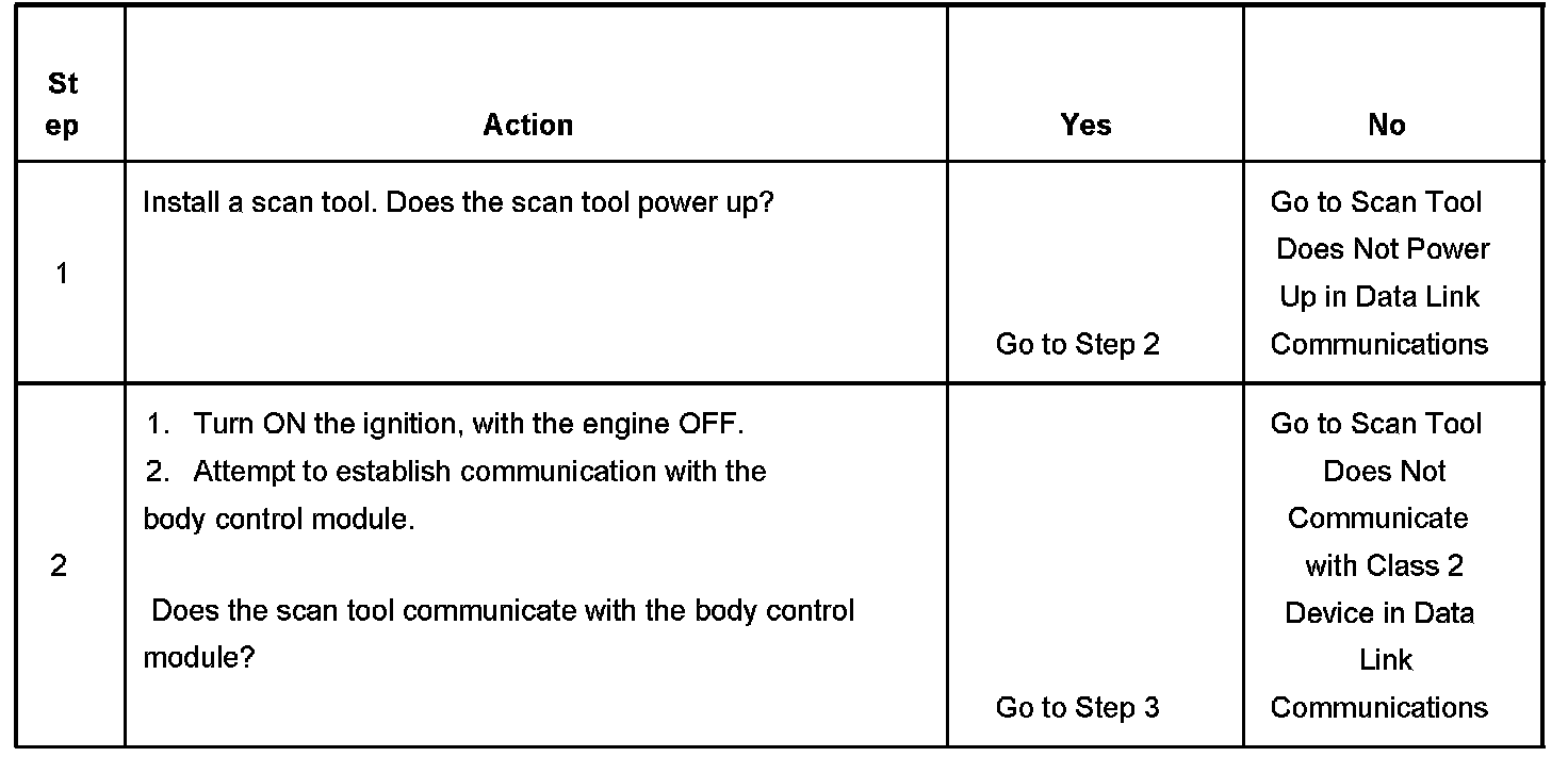 2. Lack of communication may be due to a partial malfunction of the class 2 serial data circuit or due to a total malfunction of the class 2 serial data circuit. The specified procedure will determine the particular condition.