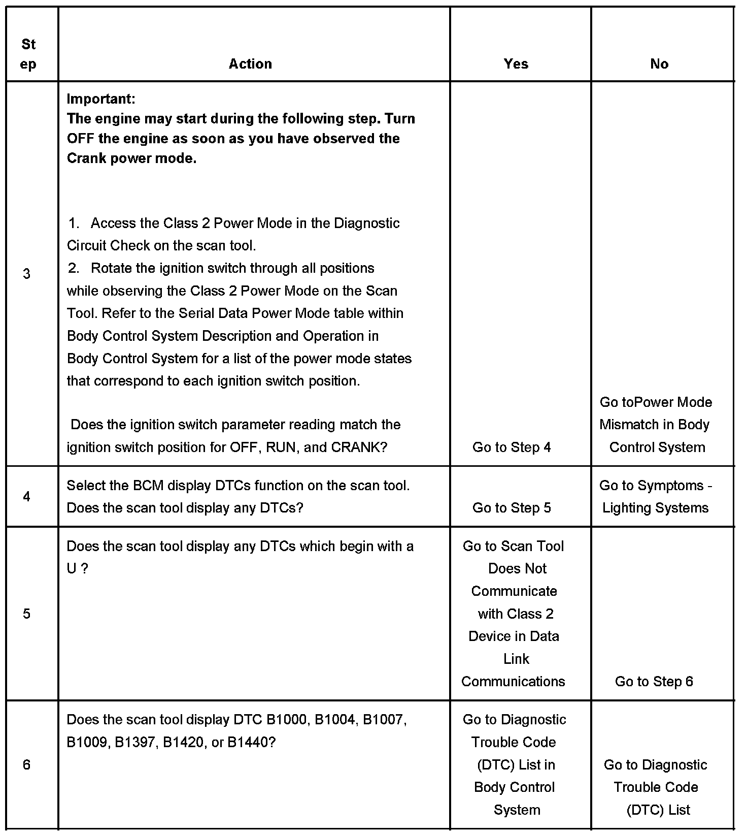 3. This step determines if an ignition switch power mode condition exists. The specified procedure will determine which diagnostic path is to be followed.