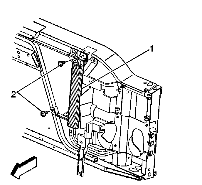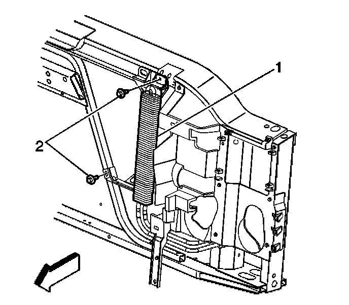 4. Remove the bolts (2) retaining the power steering cooler from the radiator support.