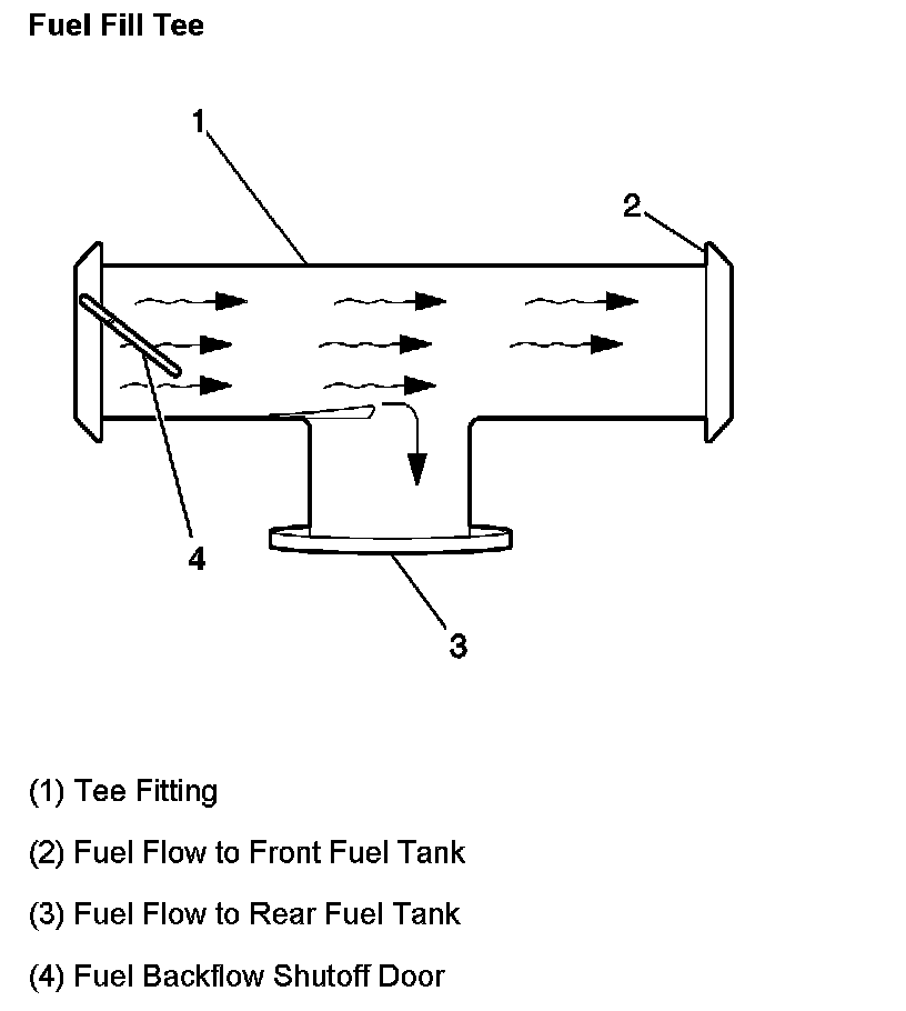 The fuel fill pipe has a built-in restrictor in order to prevent refueling with leaded fuel. When refueling dual tank applications, fuel is dispensed to the fill pipe, and over a tee fitting (1) on the rear tank. The tee fitting is configured such that approximately 80% of the fuel runs to the front tank (2), while 20% drops down in the rear tank (3). As the front tank achieves a full condition, the fill vent is obstructed, by raising fuel, which no longer allows fuel to enter the tank, i.e. the inability to vent the tank causes fuel to back up to the tee. At this point, the rear fuel tank receives 100% of the dispensed fuel until such time as the rear fuel tank vent is obstructed by the raising fuel. Once the fill vents are obstructed, fuel backs up the fill pipe and trips the dispensing nozzle. If the flow of fuel into the tanks exceeds the ability of the system to compensate, the fill nozzle will automatically shut off and the system will require 10-20 seconds to equalizer pressure before filling can resume. The front fuel tank vent runs into the rear tank to the top of the filler pipe assembly, which in turn vents to atmosphere. The fuel tank vent valves are connected and route to the canister to collect hydrocarbon emissions during operation of the vehicle.