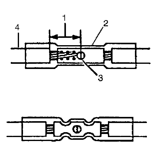 - Strip approximately 7.5 mm (5/16 in) of insulation from each wire to be spliced (1).