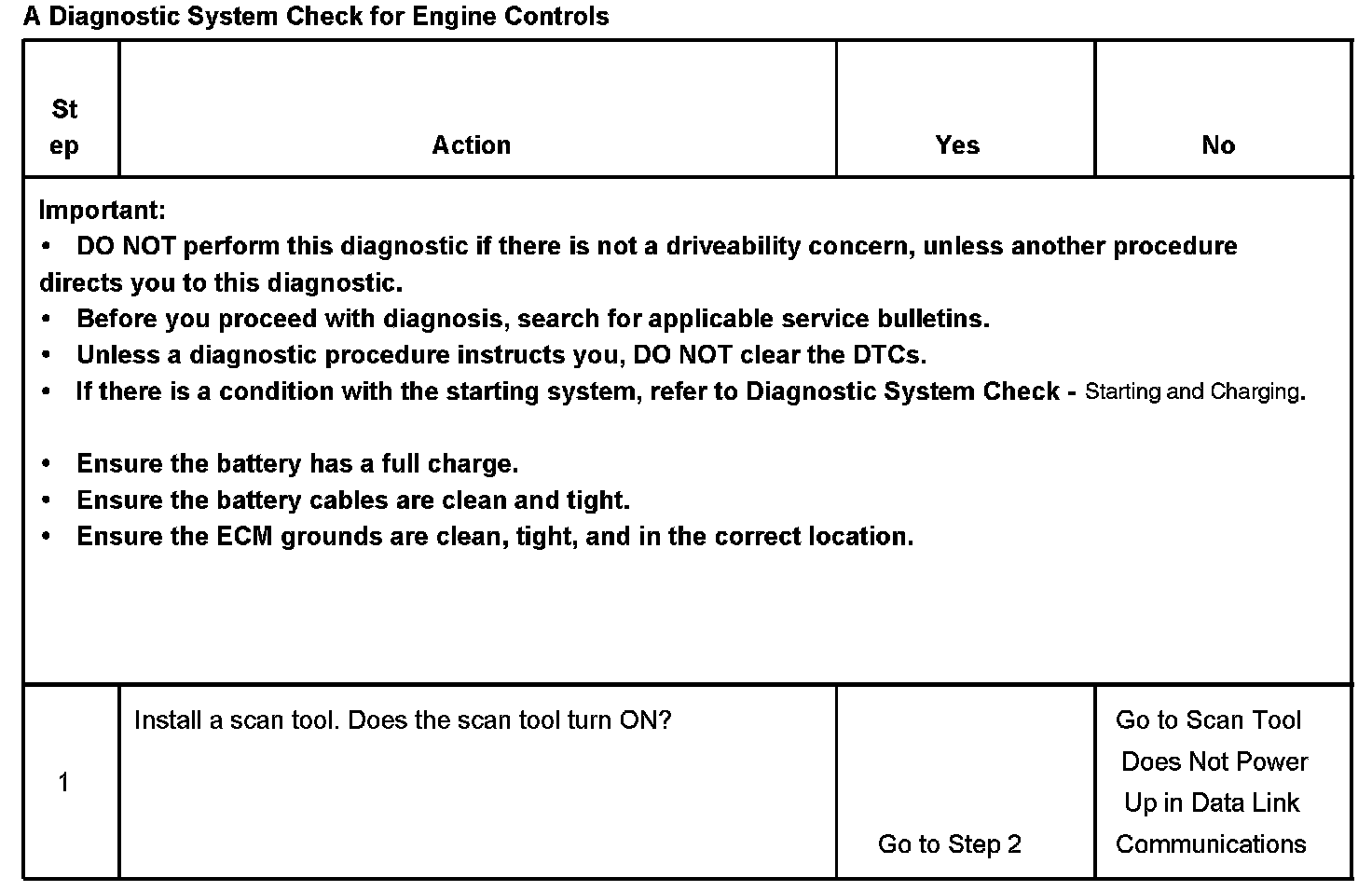 The Diagnostic System Check-Computers and Control Systems is an organized approach to identifying a condition that is created by a malfunction in the electronic engine control system. The Diagnostic System Check must be the starting point for any driveability concern. The Diagnostic System Check directs the service technician to the next logical step in order to diagnose the concern. Understanding, and correctly using the diagnostic table reduces diagnostic time, and prevents the replacement of good parts.