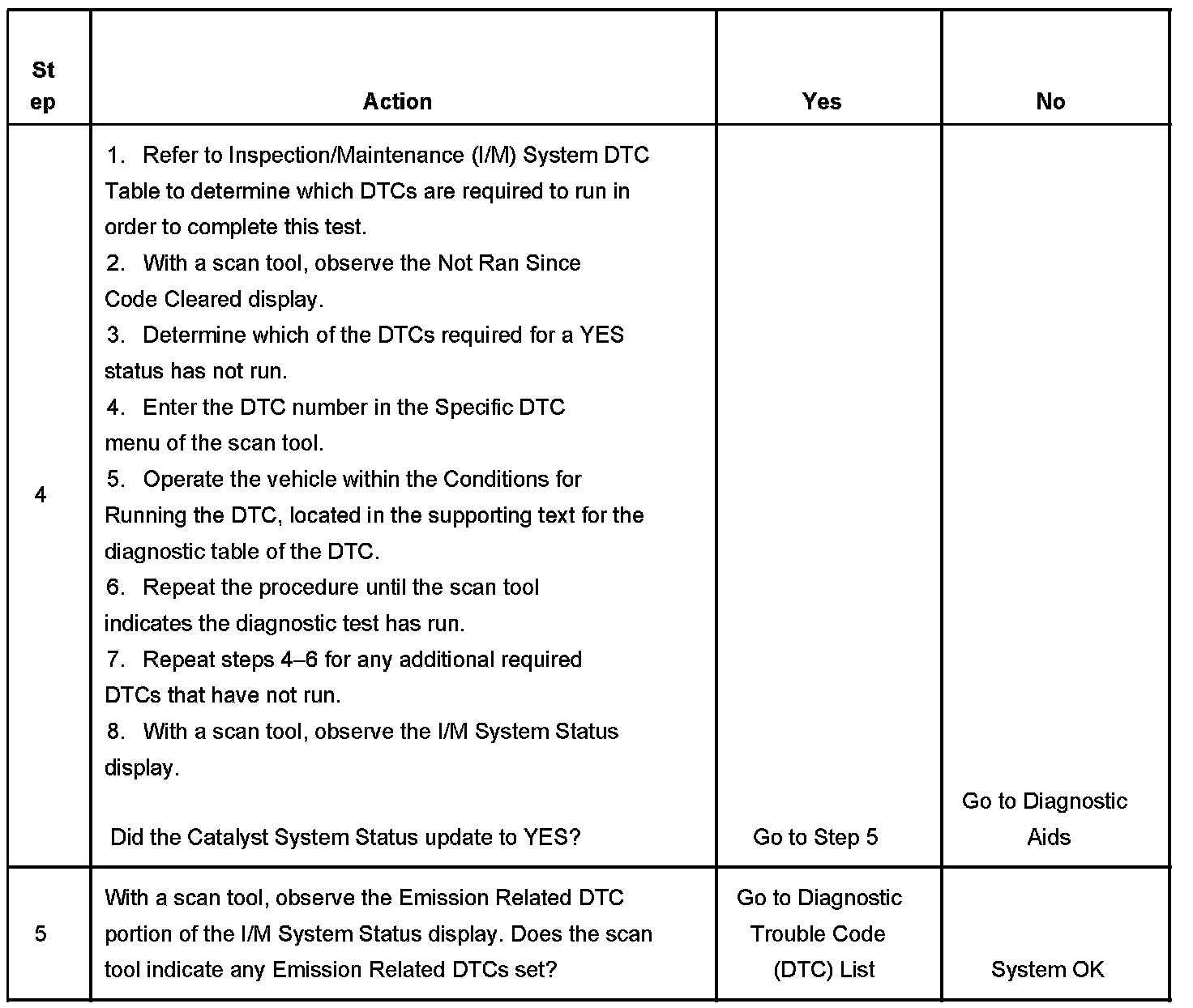 5. The I/M System Status only reports on whether or not a diagnostic has run, not what the outcome of the test was. If any Emission Related DTC sets after the tests are complete, the DTC will require diagnosis.