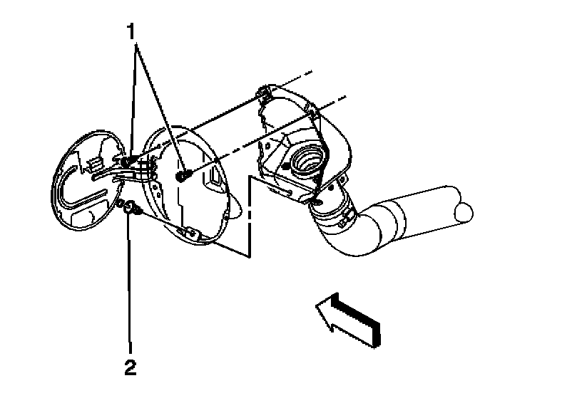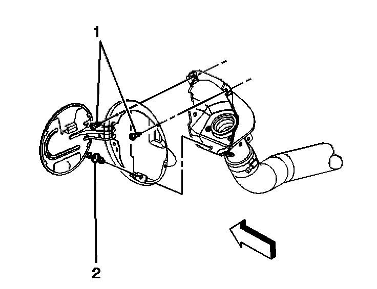 2. Remove the fuel tank filler housing to body screws (1), and retainer (2).