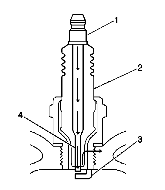 - Inspect the insulator (2) for cracks. All or part of the electrical charge may arc through the crack instead of the electrodes (3, 4).