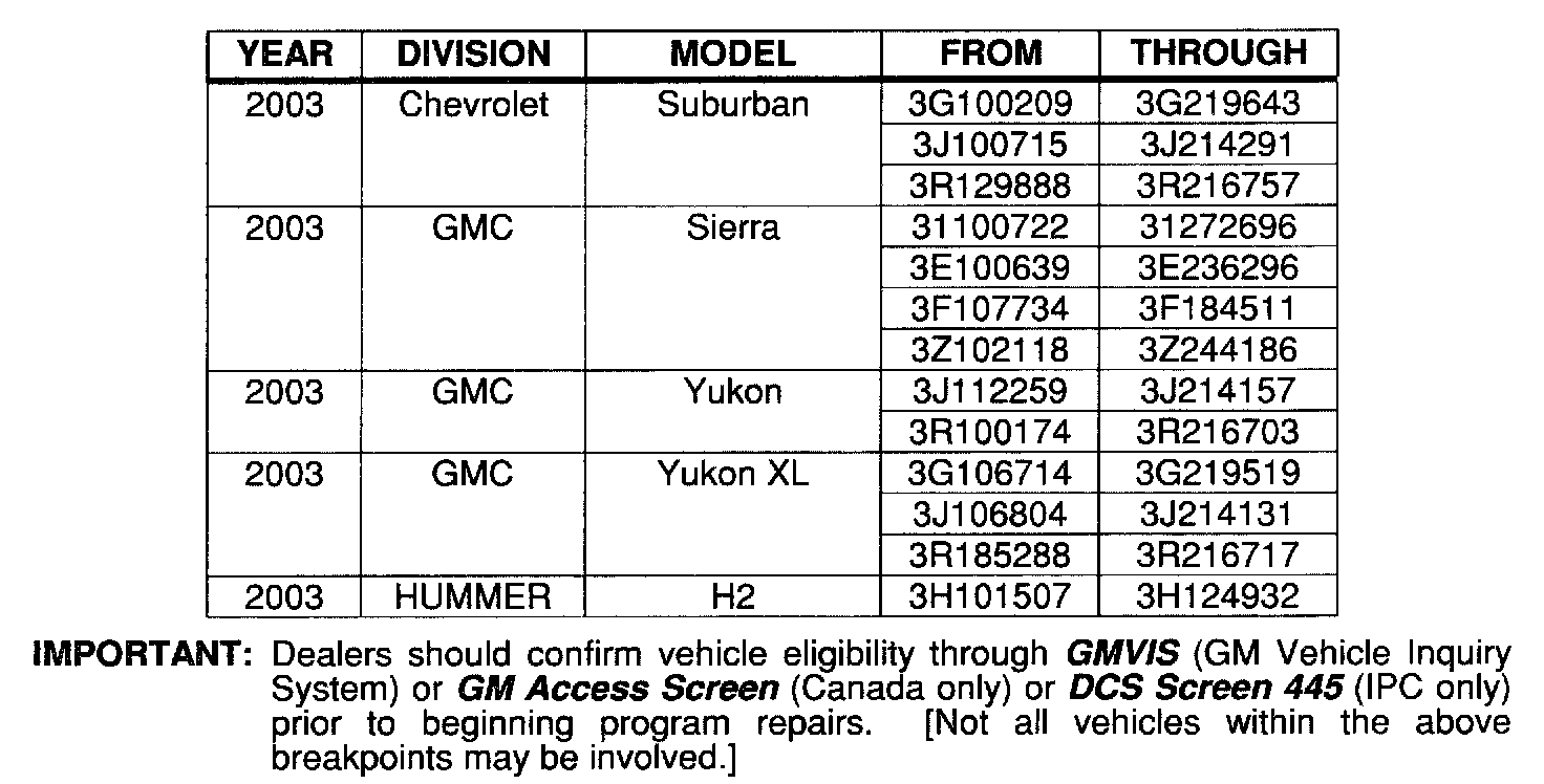 Involved are certain 2003 model year Cadillac Escalade, Escalade EXT, and Escalade ESV; Chevrolet Silverado, Avalanche, Tahoe, and Suburban; GMC Sierra, Yukon, and Yukon XL; and HUMMER H2 vehicles built within these VIN breakpoints shown.